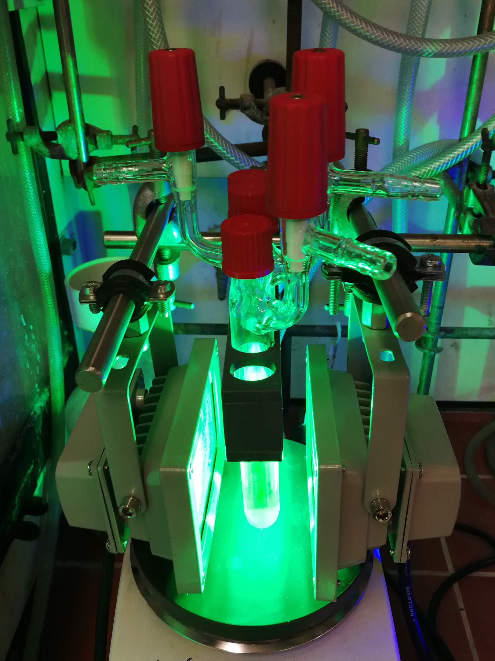 Wichtig bei den Reaktionen mit diesem Photo-Redox-Katalysator ist die Wellenlänge des Lichtes, das zur Bestrahlung verwendet wird. „Ultraviolette Strahlung ist ungeeignet, weil sie viel zu energiereich ist und die organischen Verbindungen zerstören würde“, sagt Gansäuer. Grünes Licht aus LED-Lampen ist gleichzeitig milde und energiereich genug, um die Reaktion in Gang zu setzen.