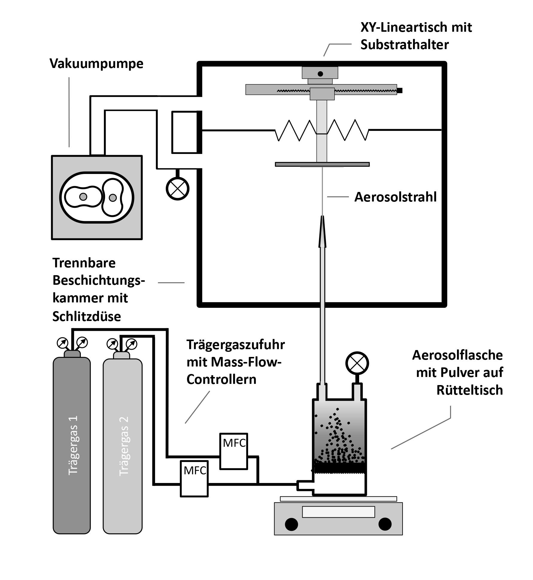 Mit der aerosolbasierten Kaltabscheidung (Powder Aerosol Deposition, PAD) lassen sich dichte Keramikschichten auf sehr verschiedene Arten von Materialien aufbringen, wie etwa auf Stahl, Glas, Silizium oder sogar auf Kunststoff. Dafür wird zunächst ein trockenes keramisches Pulver mithilfe eines Trägergases in ein Aerosol, das heißt in eine Mischung aus Gas und festen Partikeln, überführt. Anschließend wird das Aerosol in einer Vakuumkammer durch eine Düse auf mehrere 100 Meter pro Sekunde beschleunigt und auf das zu beschichtende Material gelenkt. Beim Aufprall brechen die winzigen Keramikpartikel auf. Die dadurch entstehenden, wenige Nanometer großen Bruchstücke besitzen frische aktive Oberflächen. Sie bilden fest haftende dichte Beschichtungen mit einer Dicke zwischen einem und 100 Mikrometern.