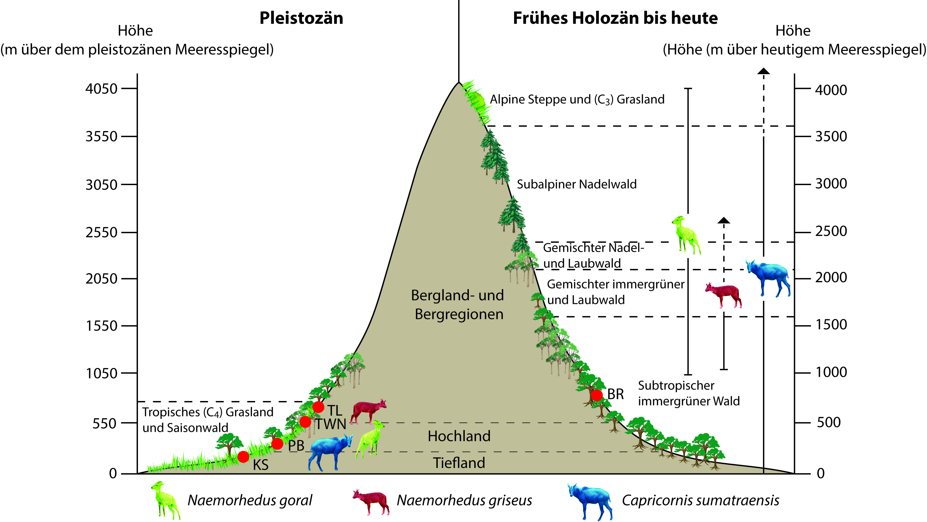 Die Isotopenmessungen ergaben, dass der Südliche Serau (Capricornis sumatraensis) im Pleistozän ein Generalist war. „Diese Art ernährte sich sowohl von Blättern als auch Gras. Sie kam offenbar mit verschiedenen Lebensräumen wie Wäldern und Grasland zurecht“, sagt Kantapon Suraprasit. Die heutigen Populationen des Südlichen Seraus lebten nur noch in hochgelegenen Wäldern. Die Messergebnisse zeichnen für das Leben des Grauen Gorals (Naemorhedus goral) und des Chinesischen Gorals (Naemorhedus griseus) im Pleistozän ein anderes Bild: „Wir waren überrascht, dass diese beiden Arten sich ganz überwiegend von Gras ernährten und wohl nur in offenen Landschaften vorkamen“, sagt der Wissenschaftler. Heute fänden sich die Gorale in niedrig bis hochgelegenen Bergwäldern, an steilen Hängen und Felsklippen oder in extrem hohen Berggraslandschaften bis zu 3.000 Meter über dem Meeresspiegel.