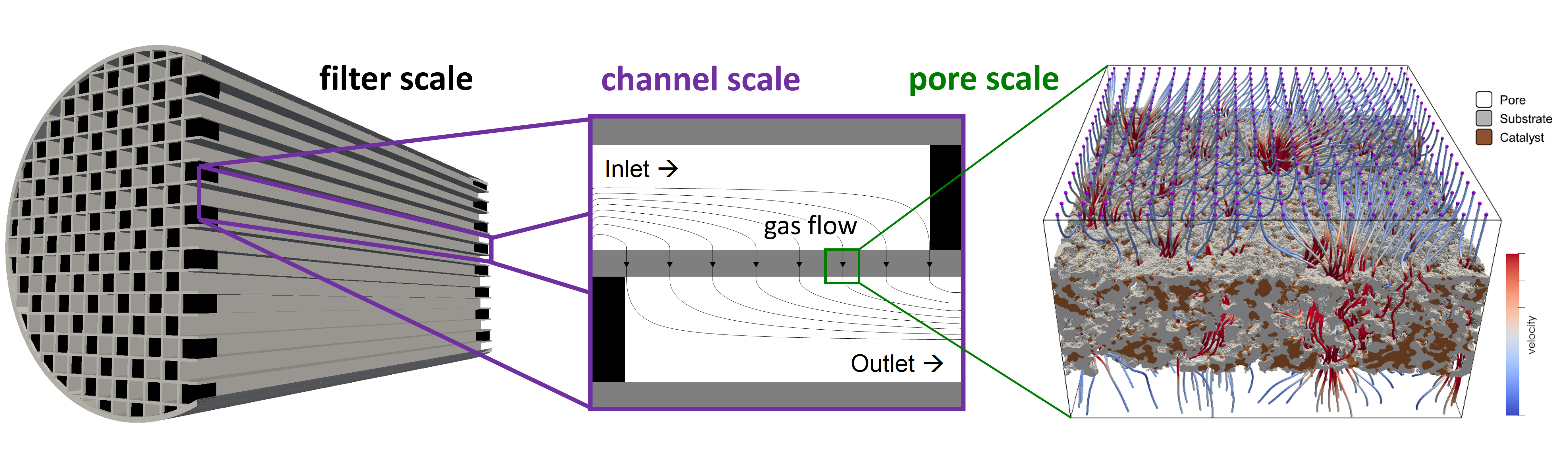 But how can mathematics contribute to evaluating the design of catalytic components and optimising their inherent processes? Catalytic filters are created using porous materials which resemble solid sponges. The pores contain catalytic particles whose specific purpose is to accelerate chemical reactions that break down harmful pollutants. Simulating this process at the pore scale is quite complex and produces large amounts of data. The goal of the ML-MORE project group is to speed up these simulations by applying model reduction and data-based methods of machine learning (ML), and thereby generate reliable models for predicting the chemical conversion rate, or the efficiency of the catalytic filter.
