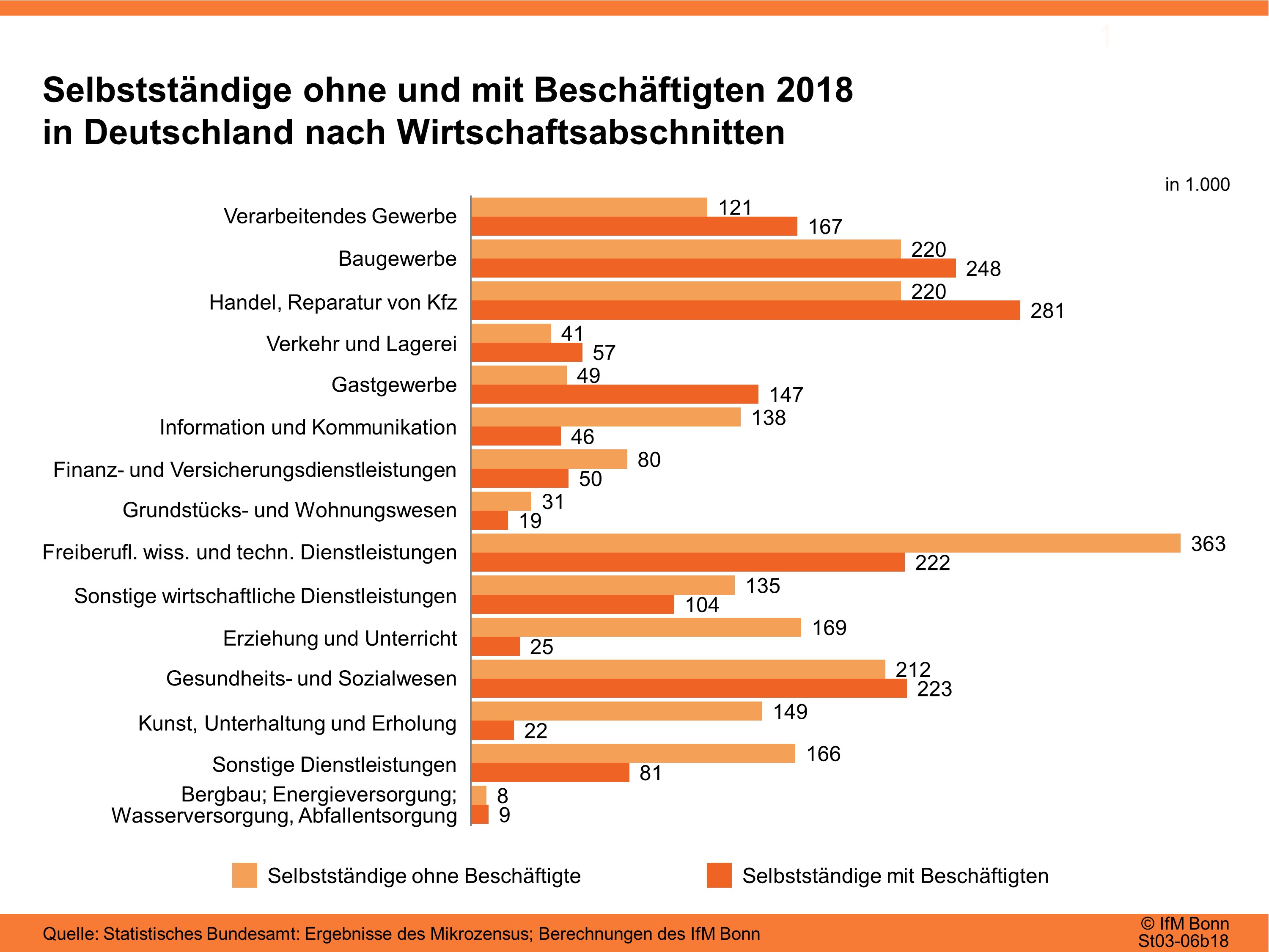 Über die Hälfte der Selbstständigen hatte in 2018 keine Beschäftigten. Gut die Hälfte von diesen so genannten Soloselbstständigen ist im Bereich freiberufliche wissenschaftliche und technische Dienstleistungen, im Baugewerbe, im Handel sowie im Gesundheits- und Sozialwesen tätig. Insgesamt ist jedoch die Zahl der Soloselbstständigen seit 2011 deutlich stärker gesunken (-8,8 %) als die der Selbstständigen mit Beschäftigten (-3,9 %).