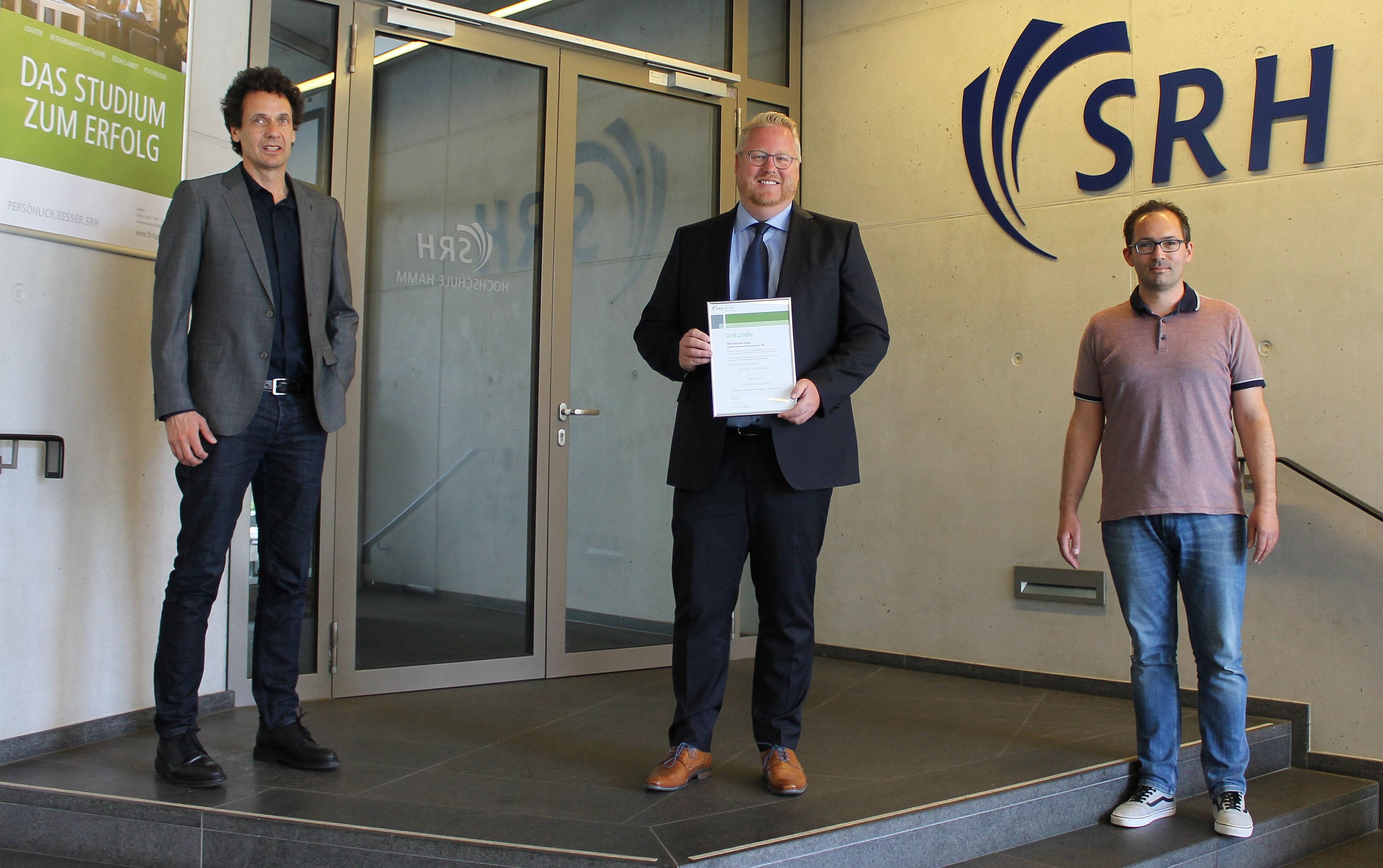 Die SRH Hochschule Hamm verstärkt ihr akademisches Team. Prof. Dr. Lars Rickmann aus dem Fachbereich Technik und Wirtschaft erhielt am Dienstag, den 21.04.2020 seine offizielle Professorenurkunde. Rektor Prof. Dr. Lars Meierling und der Dekan des Fachbereiches, Prof. Dr. Claus Wilke, gratulierten zum Professorentitel – wie es sich in diesen Zeiten mit gebotener Rücksicht auf andere gehört ohne Handschlag und mit dem empfohlenen Sicherheitsabstand auch beim anschließenden Foto.