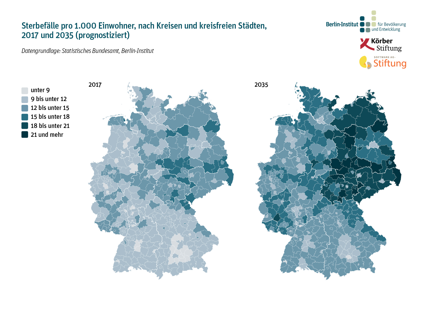 Derzeit führt uns die Covid-19-Pandemie vor Augen, wie Menschen gerade nicht aus dem Leben gehen wollen: Dort, wo die Gesundheitssysteme überlastet sind, müssen sie womöglich um eine gute palliative Versorgung bangen. Die derzeitige Kontaktsperre stellt zudem infrage, ob Sterbende in Krankenhäusern, Hospizen und Pflegeeinrichtungen so begleitet werden können, wie sie es sich eigentlich wünschen – von ihren Angehörigen, aber auch von ehrenamtlichen Sterbebegleitern. Die aktuelle gesellschaftliche Auseinandersetzung mit dem Sterben ist einer akuten Krisensituation geschuldet. In Zukunft setzt der demografische Wandel das Thema weniger krisenhaft, aber dafür umso langfristiger auf die Agenda: In einigen deutschen Landkreisen dürften im Jahr 2035 statistisch auf eine Geburt vier Beerdigungen kommen – heute liegt das Verhältnis dort bei eins zu zwei. Was vielen Menschen als Privatangelegenheit erscheint, wird angesichts dieser Zunahme an Sterbefällen auch zu einem gesellschaftspolitischen Thema: Die Alterung der Bevölkerung fordert einen neuen Umgang mit dem Sterben. Zu diesem Schluss kommt eine aktuelle Studie des Berlin-Instituts für Bevölkerung und Entwicklung, der Körber-Stiftung und der Software AG – Stiftung. Mit einer repräsentativen Umfrage und vertiefenden Leitfadeninterviews gehen die Autoren der Frage nach, welche Wünsche, Ängste und Hoffnungen die Menschen mit ihrem Lebensende verknüpfen.