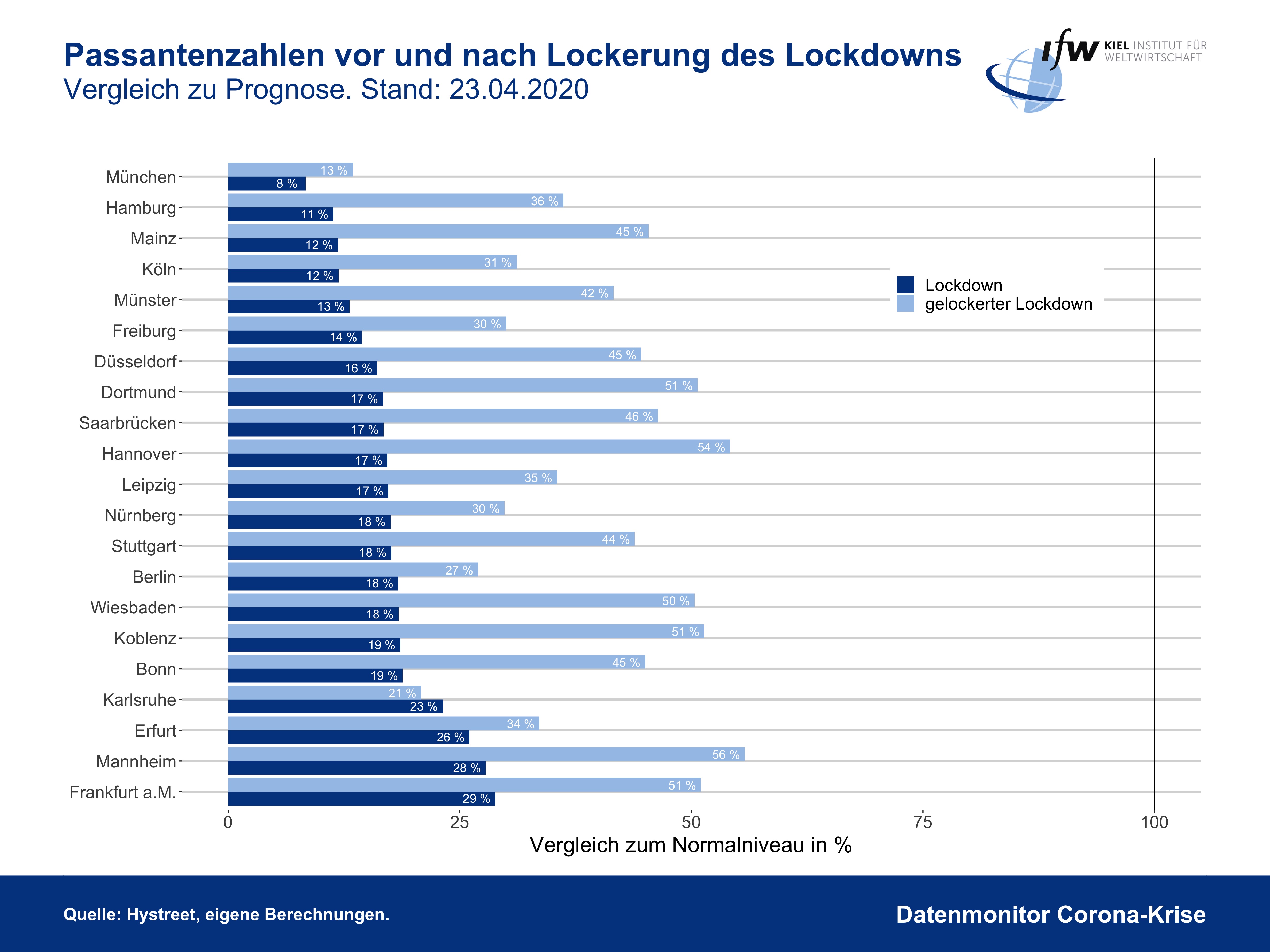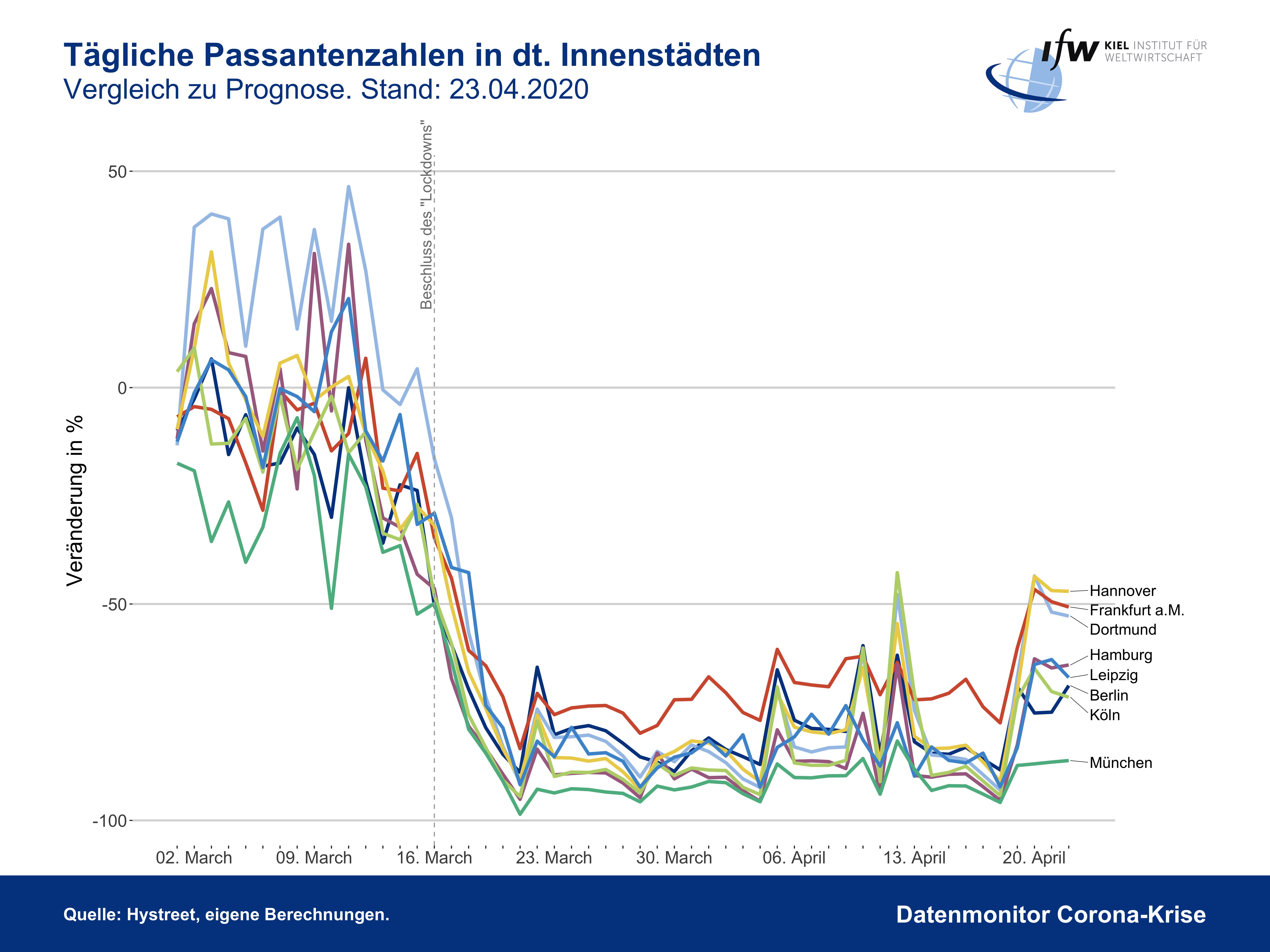 Das Institut für Weltwirtschaft in Kiel wertet seit Beginn der Corona-Krise Daten des Kölner Startup-Unternehmens hystreet.com aus. Dieses Unternehmen misst mit Hilfe von Laserscannern die Anzahl der Passanten, die 118 zentrale Stellen in 57 deutschen Innenstädten passieren. Parks oder andere Erholungsorte zählen nicht dazu. Passantenfrequenzdaten sind sehr gute Indikatoren für die Umsätze, die Geschäfte und Gastronomie in den Innenstädten machen.