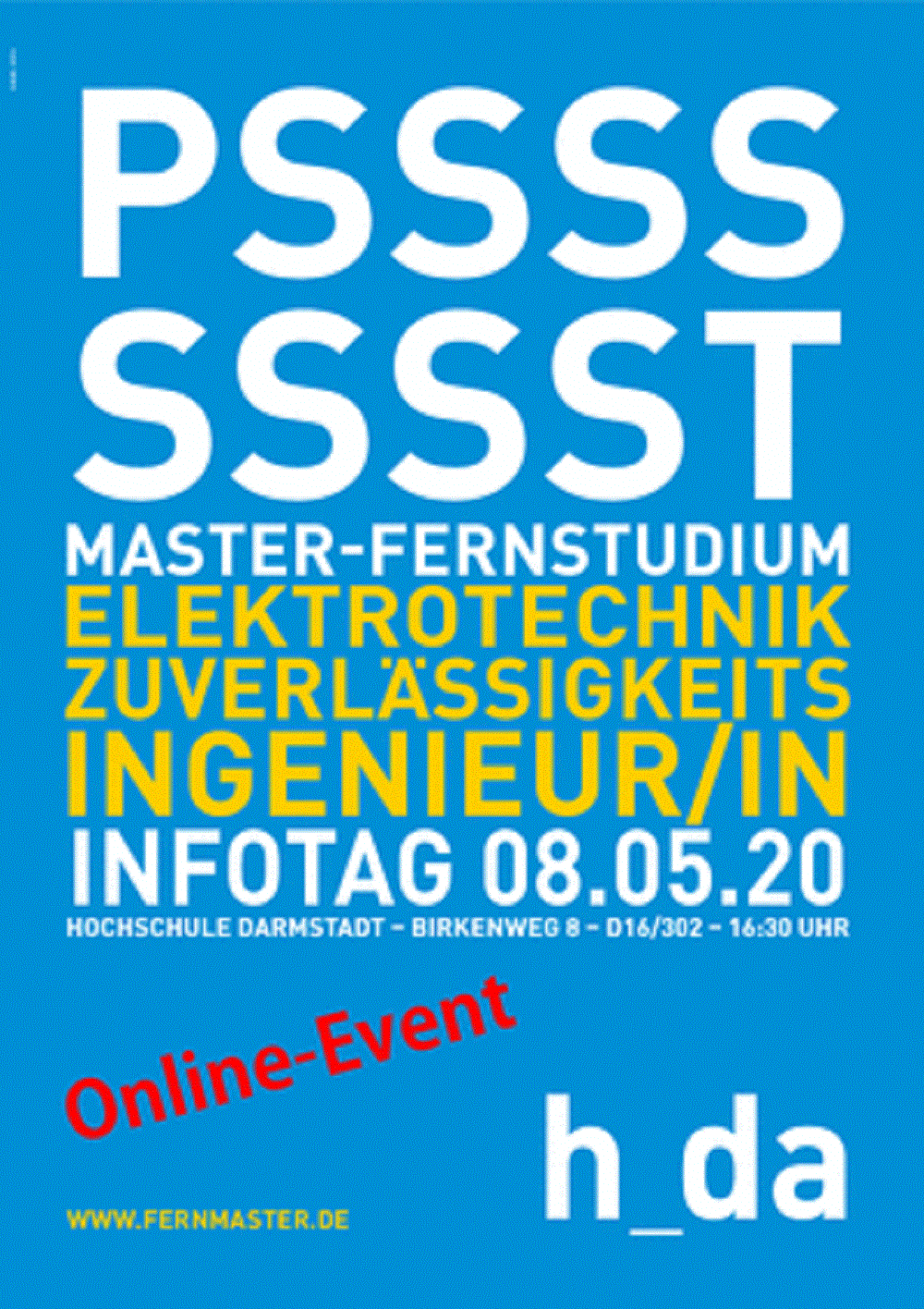 Darmstadt/Koblenz – Wer sich in Coronazeiten mit Ausgangs- und Kontaktbeschränkungen über neue berufliche Wege informieren möchte, kann am Freitag, den 08. Mai an einem Online-Event der Hochschule Darmstadt teilnehmen: Um 16:30 Uhr findet hier eine Video-konferenz über zoom zu den beiden elektrotechnischen Fernstudiengängen Elektrotechnik (M.Sc.) und Zuverlässigkeitsingenieurwesen (M.Eng.) statt. Die Teilnehmenden erfahren alles über die Studieninhalte, den Ablauf und die Organisation des Fernstudiums und haben dabei Gelegenheit live Fragen zu stellen – entweder mündlich oder schriftlich per Chatfunktion. Alle Interessierten sind herzlich eingeladen teilzunehmen – für eine erleichterte Planung werden sie gebeten sich telefonisch (06151) 16-30128 oder per Mail an info@fernmaster.de anzumelden – hier erhalten sie den Zugangslink.