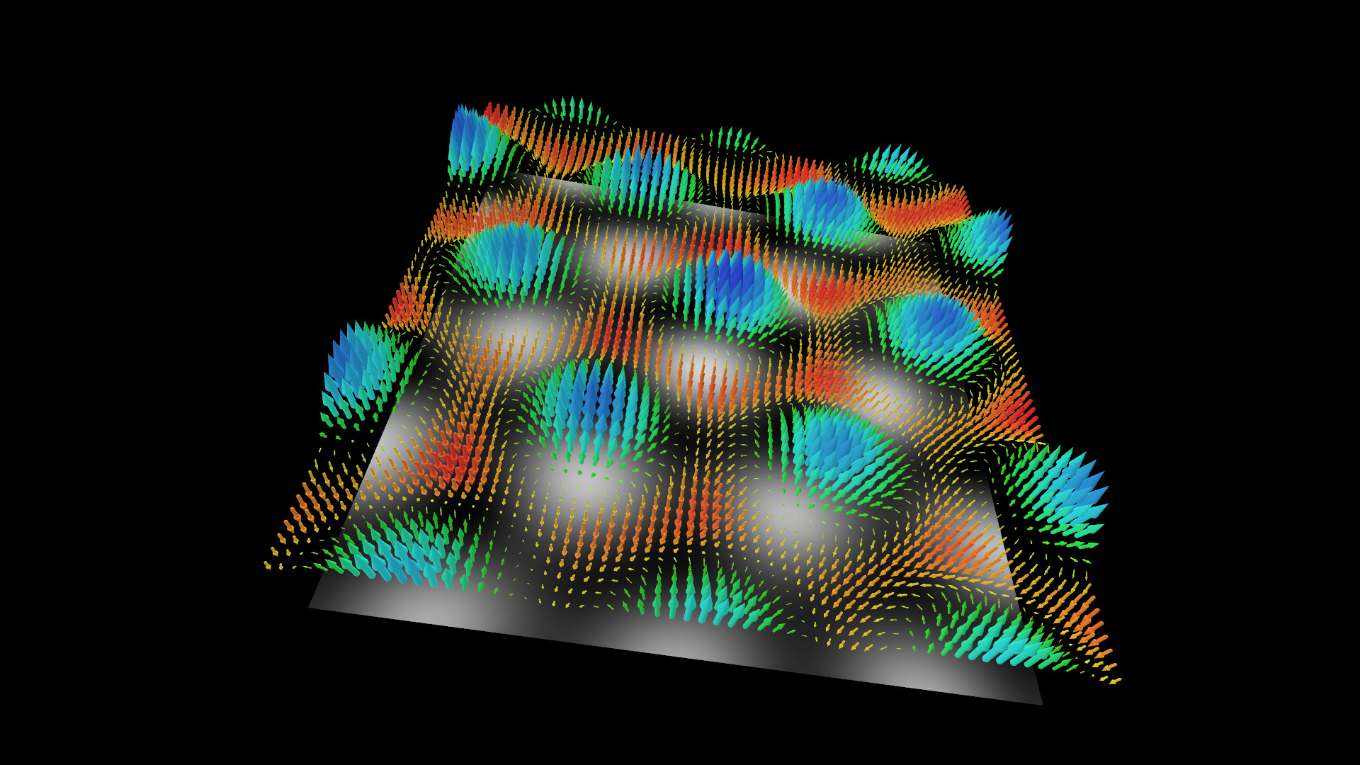 To this end, the team created plasmons on the gold surface whose electric fields formed optical skyrmions (see image). They then systematically increased the time interval between pump and probe laser pulses by about 100 attoseconds. The sequence of the reconstructed vector images results in a movie of how the field in the optical skyrmion is oscillating up and down.