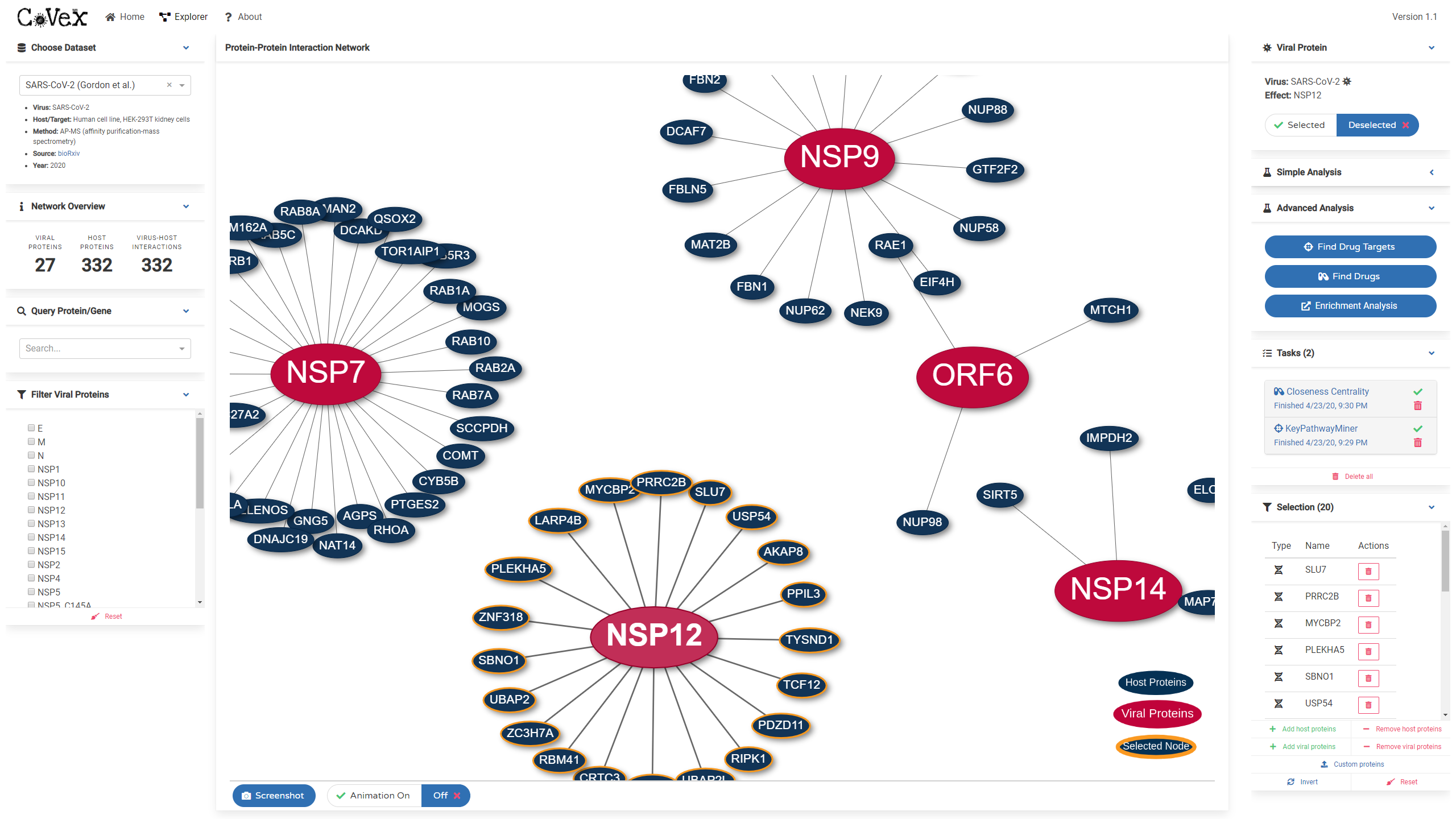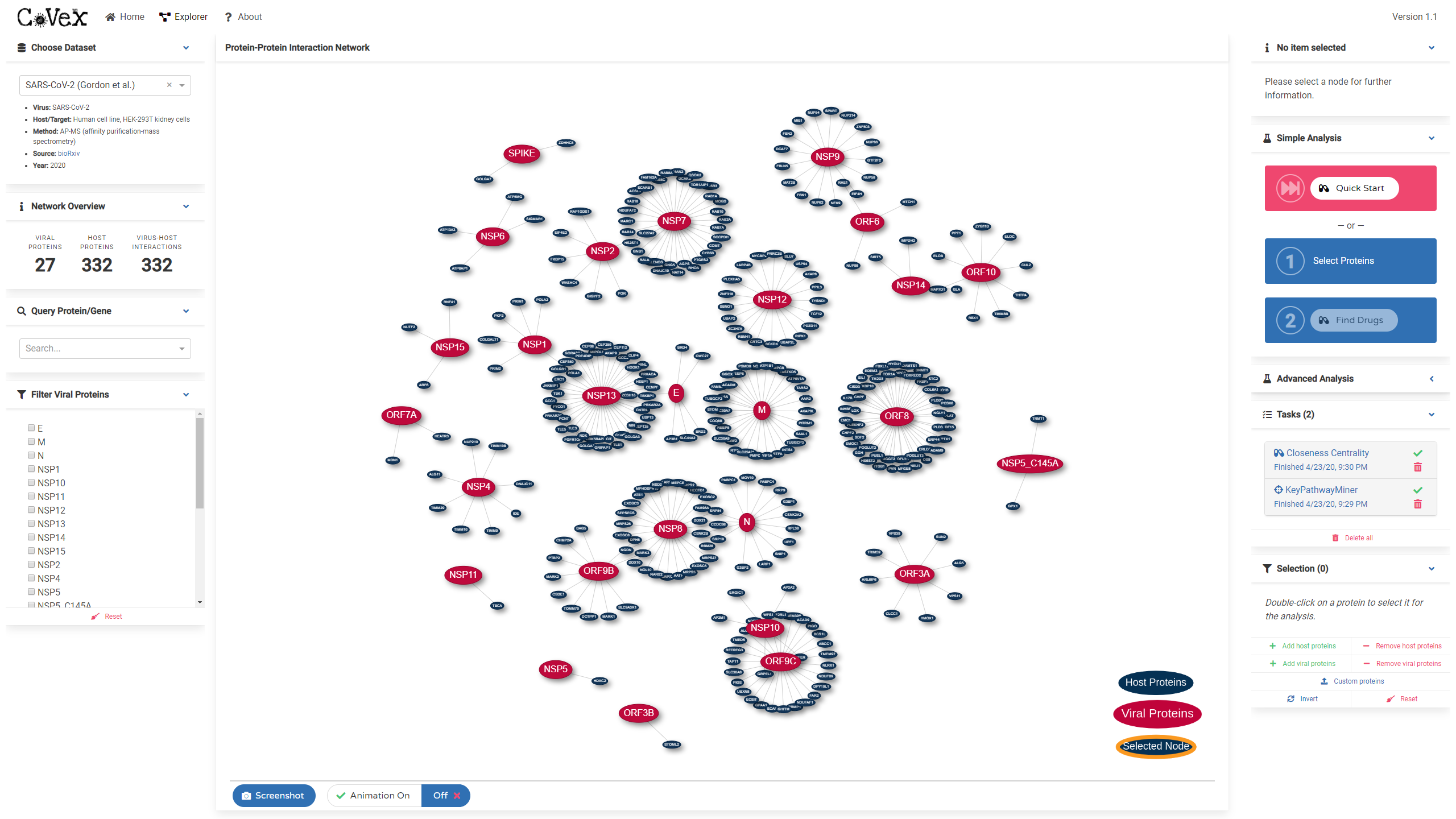 Der sogenannten Coronavirus Explorer (CoVex) integriert die Virus-Mensch-Interaktionsdaten für SARS-CoV-2 und SARS-CoV. CoVex soll dabei helfen, ein umfassendes Verständnis der Infektionsmechanismen zu ermöglichen und konzentriert sich dabei nicht nur auf das Virus und seine direkten Interaktionspartner, sondern bezieht insbesondere das Wirts-Protein-Interaktionsnetzwerk mit ein.
