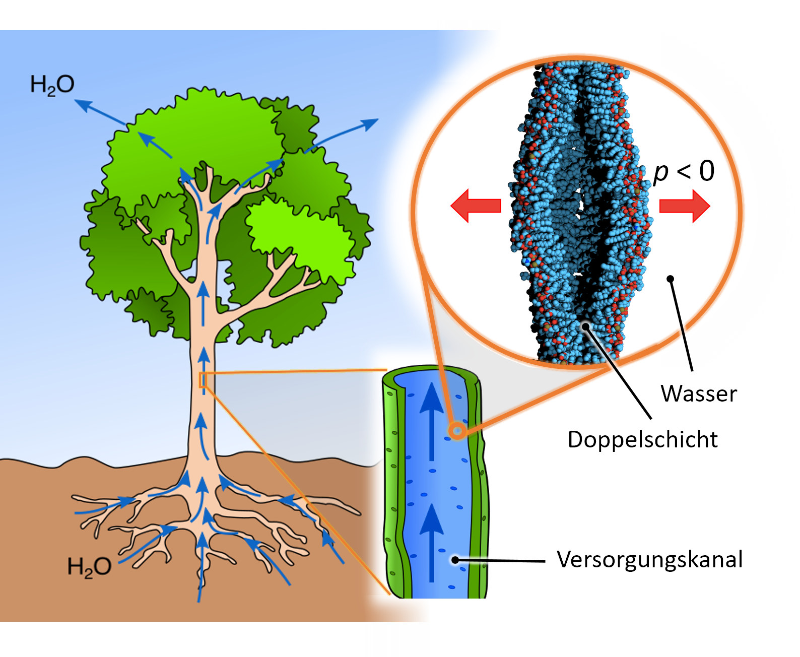 Mittels Unterdruck saugen Pflanzen Wasser aus der Erde. Weshalb der Wert des Drucks dabei etwa -100 bar nicht unterschreitet, war bislang ein ungelöstes Rätsel. Eine interdisziplinäre und internationale Forschergruppe berichtet nun in der Fachzeitschrift Proceedings of the National Academy of Sciences (PNAS), dass offenbar so genannte Lipidaggregate in den Pflanzensäften für das Phänomen verantwortlich sind. Simulationen und Modellrechnungen zeigen, wie sich auf Grund der Lipide wachsende Hohlräume bilden, die die Flüssigkeitssäule bei zu großen Unterdrücken abreißen lassen.
