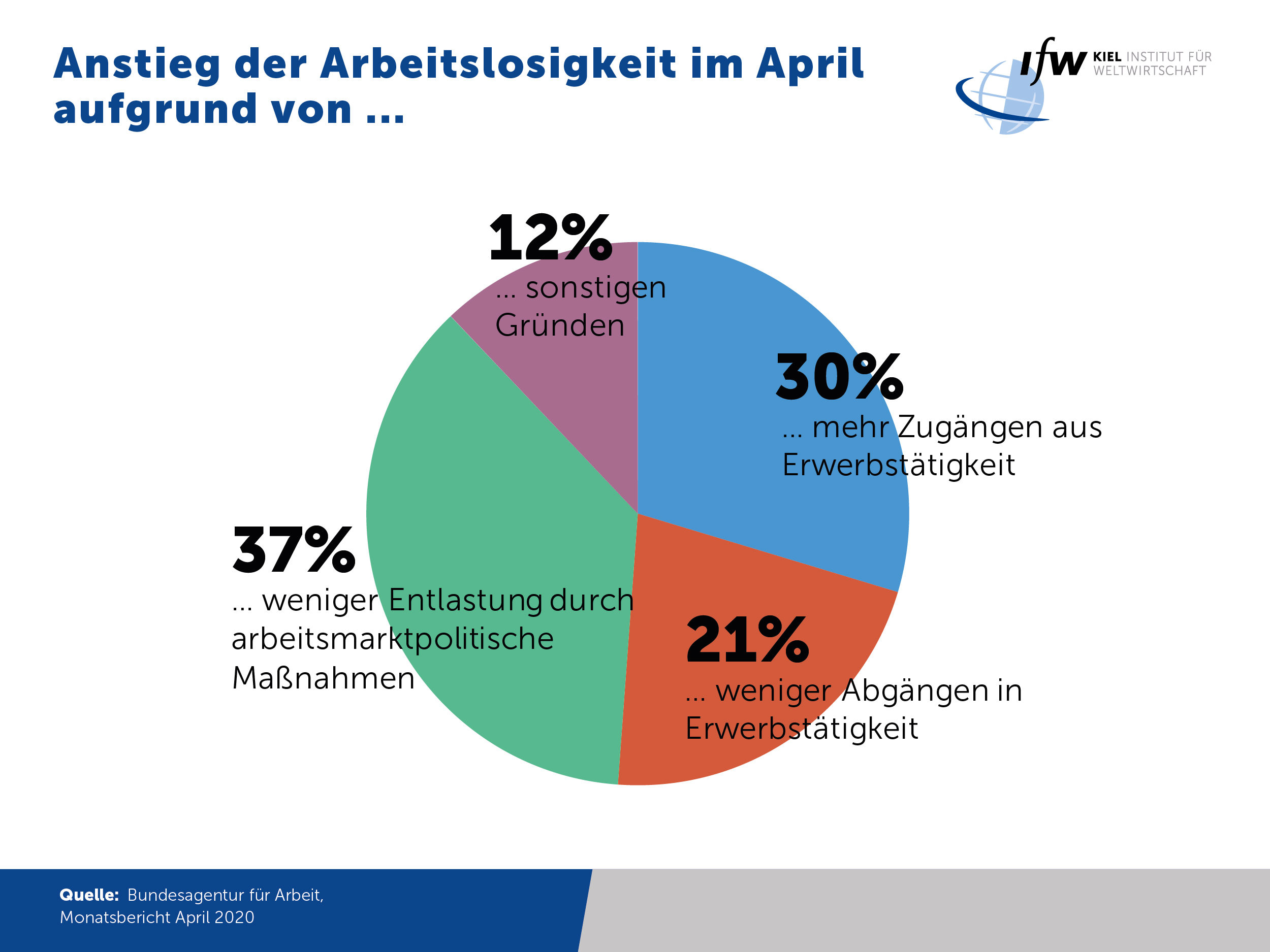 Der Anstieg der Arbeitslosigkeit wurde keineswegs nur von Entlassungen verursacht, diese waren gerade einmal für 30 Prozent des Anstiegs verantwortlich. Weitere 21 Prozent gingen auf weniger Einstellungen zurück. Knapp 40 Prozent der zusätzlichen registrierten Arbeitslosen kamen allerdings aus arbeitsmarktpolitischen Maßnahmen. Diese wurden aufgrund der Kontaktbeschränkungen von den Arbeitsagenturen zurückgefahren. Die Teilnehmer an solchen Maßnahmen sind nicht als arbeitslos registriert. Das bedeutet, dass 40 Prozent der zusätzlichen registrierten Arbeitslosen de facto zuvor bereits arbeitslos waren. Der Anstieg der registrierten Arbeitslosigkeit überzeichnet insofern das wahre Ausmaß der Krise am Arbeitsmarkt etwas, aber auch ohne diesen Effekt wäre der Anstieg der Arbeitslosigkeit im April ein Rekord.
