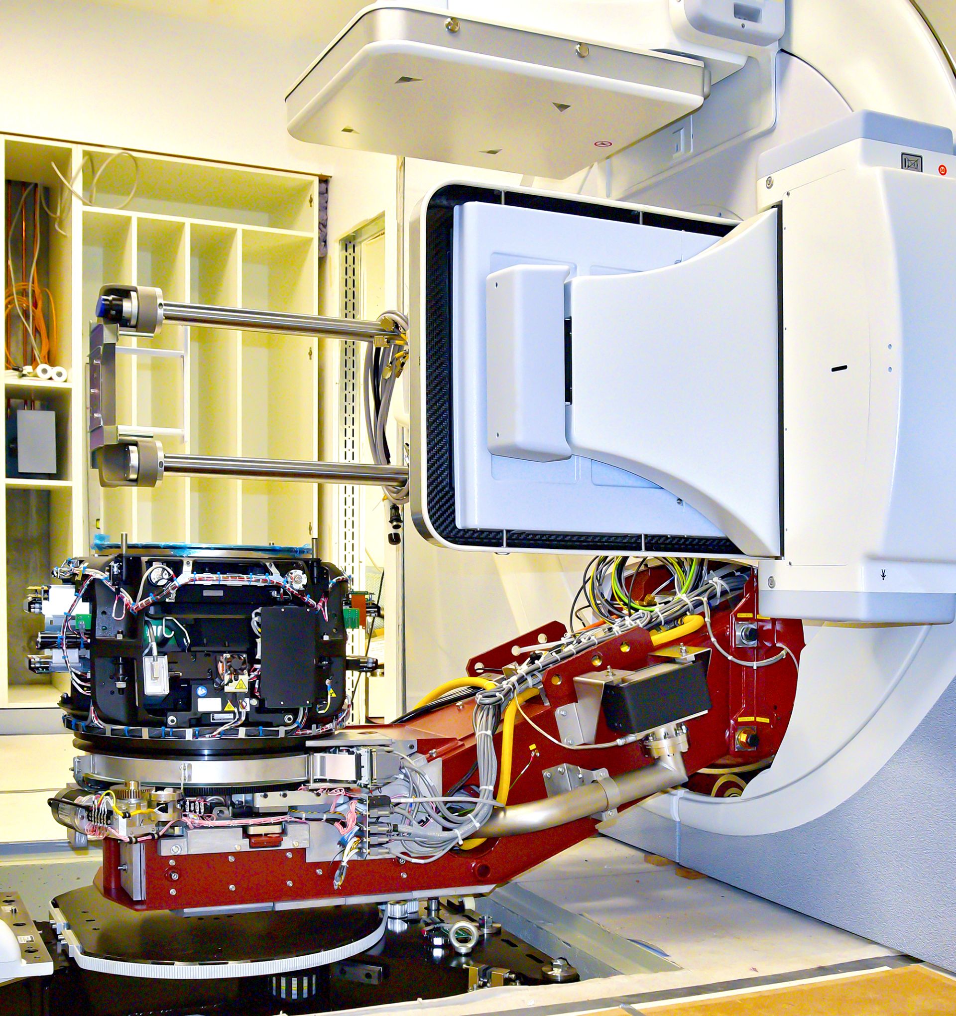 Ein weiterer entscheidender Vorteil des neuen Linearbeschleunigers ist die Kombination von Bestrahlungskopf und integriertem Röntgengerät. Dies ermöglicht hochauflösende dreidimensionale Bildgebung während der Therapiesitzung, um die Lage des zu bestrahlenden Gewebes permanent zu kontrollieren. Dies ist insbesondere für Tumore in oder in der Nähe von beweglichen Organen wie Lunge, Darm oder Blase von großem Vorteil. Bisher verfügt die Klinik an zwei Behandlungsplätzen über die Kombination eines Linearbeschleunigers mit einem fahrbaren Computertomogaphen – ein CT on Rails. Um hier die notwendigen Bilder anfertigen und mit dem Therapieplan vergleichen zu können, verging vor der eigentlichen Bestrahlung bisher eine längere Zeit. Dank der neuen, modernen Technik wird sich nun die Dauer der Vorbereitung und der eigentlichen Bestrahlung verkürzen. „Der Effekt dieser Technik für die Patienten und das Therapieansprechen soll in translationalen, patientennahen Studien des OncoRay erforscht werden.“ ergänzt Prof. Mechthild Krause, die zudem das OncoRay – Nationales Zentrum für Strahlenforschung in der Onkologie – leitet.