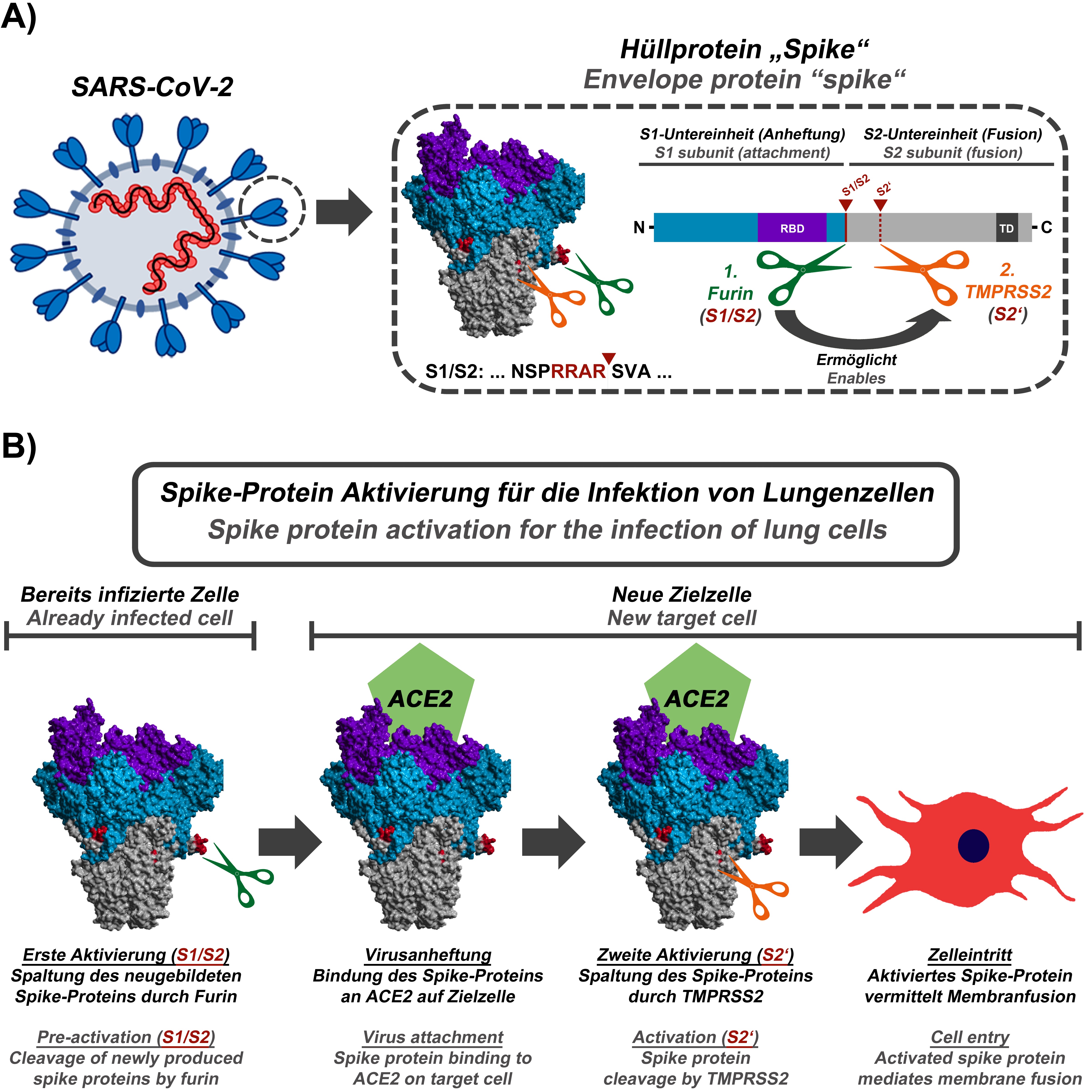 Das neue Coronavirus SARS-CoV-2 wurde von Tieren auf den Menschen übertragen und breitet sich weltweit aus. Es verursacht die neue Lungenkrankheit COVID-19, an der schon über 200.000 Menschen gestorben sind. Das Spike-Protein auf der Virusoberfläche dient dem Virus als Schlüssel zur Wirtszelle. Es erlaubt dem Virus, sich an Zellen anzuheften und anschließend mit den Zellen zu verschmelzen, um so seine Erbinformation für die virale Vermehrung in die Zellen einzuschleusen. Dazu müssen Aktivierungssequenzen des Spike-Proteins durch Enzyme der Zellen, sogenannte Proteasen, gespalten werden. Das Spike-Protein von SARS-CoV-2 trägt eine Aktivierungssequenz an der sogenannten S1/S2-Spaltstelle, die man von hochpathogenen Vogelgrippe-Viren kennt, aber in SARS-CoV-2 eng verwandten Viren bislang nicht finden konnte. Die Bedeutung dieser Sequenz für das Virus war bisher unbekannt.