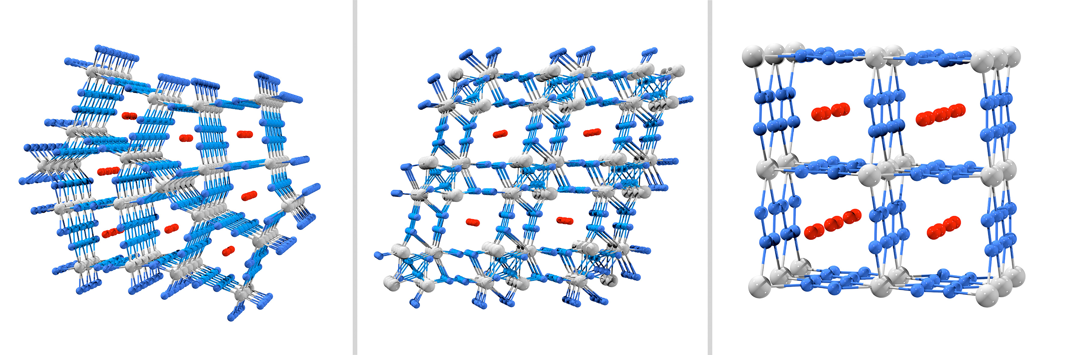 It's an everyday experience: the stronger the pressure you put on an object from all sides, the more it is compressed. The volume decreases, hollow spaces inside disappear. Yet it is precisely this experience that the new high-pressure experiments at the University of Bayreuth contradict. At a compression pressure of around one million atmospheres, such as exists around 2,500 kilometres below the Earth’s surface, porous framework structures are formed from nitrogen atoms and the atoms of a metal. Here, nitrogen atoms build up zigzag chains, for example. Nitrogen molecules (N₂) penetrate into the cavities of the new crystals. The metals used in the experiments were hafnium (Hf), tungsten (W), and osmium (Os). These belong to the group of transition metals due to their positions in the periodic table of elements.
