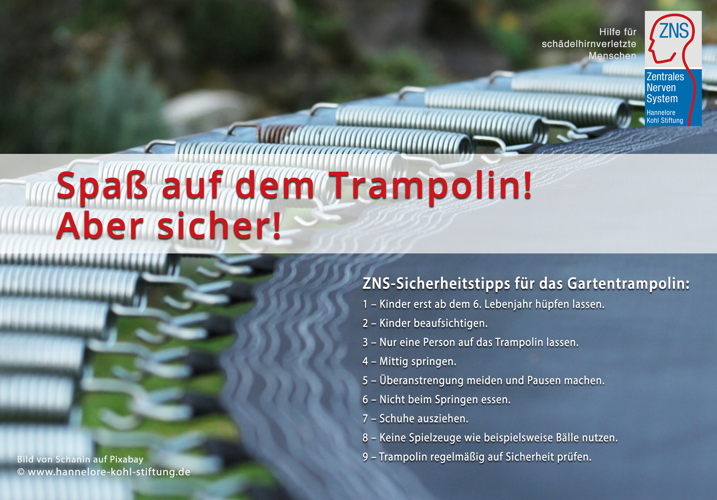 „Wichtig ist vor allem, die Kinder nie unbeaufsichtigt zu lassen“, betont Helga Lüngen von der ZNS – Hannelore Kohl Stiftung. “Selbst ältere Geschwister haben oft ein anderes Bewusstsein für Risiken und schätzen Gefahrenquellen falsch ein. Und wenn der Spaß beim Springen erst beginnt, sind vorab vereinbarte Regeln schnell vergessen. Nur wer das Geschehen rund ums Trampolin aufmerksam beobachtet, kann im Ernstfall auch entsprechend handeln.“