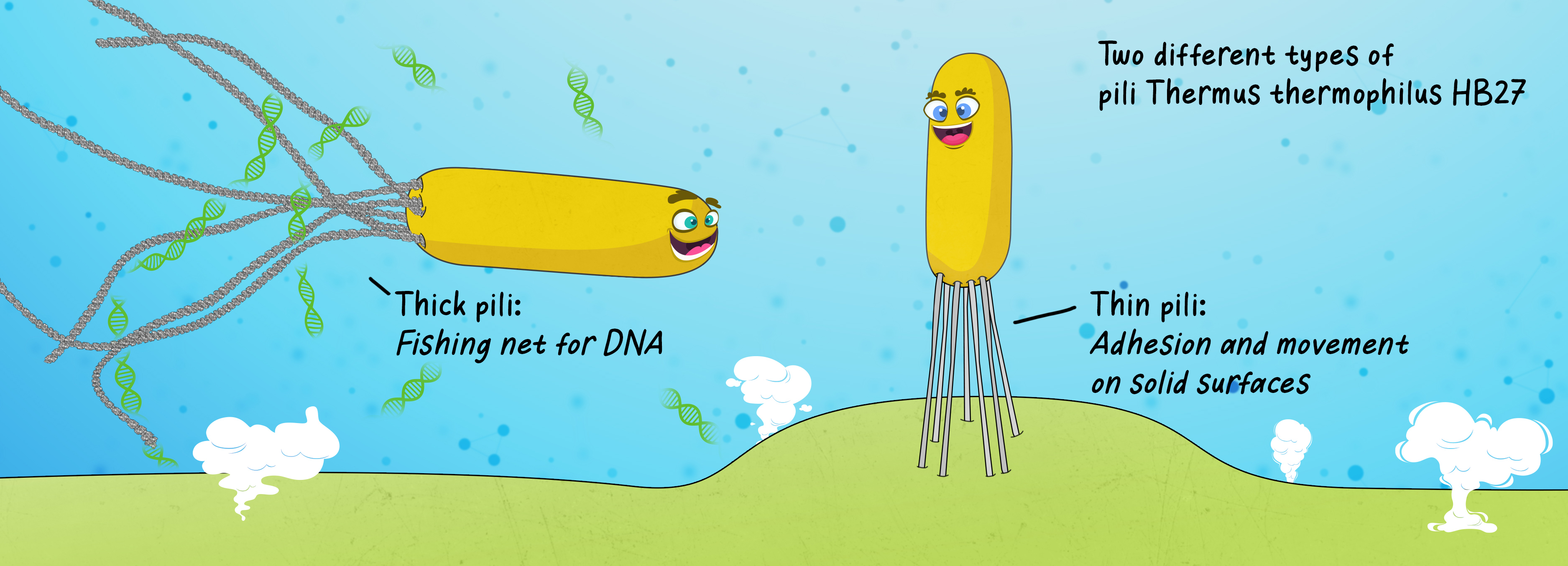 Heat-loving bacteria use various tiny surface hairs for movement and DNA reception