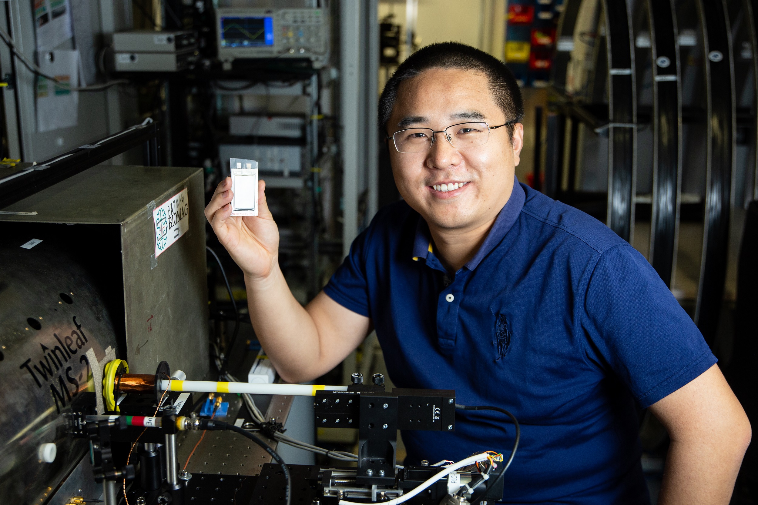 Yinan Hu, a member of Professor Dmitry Budker's research group at JGU, holding a battery cell, alongside a device which measures the state of charge