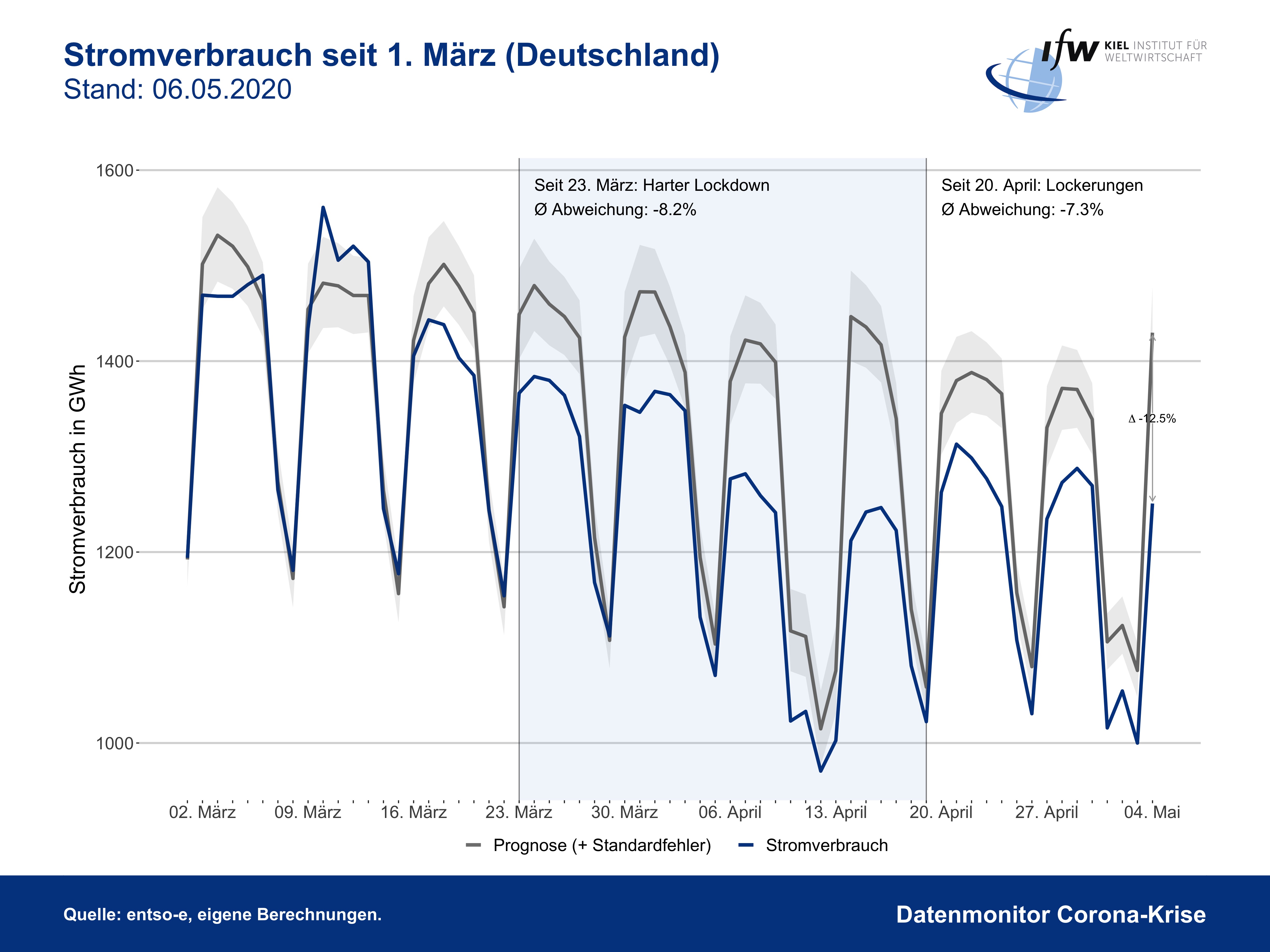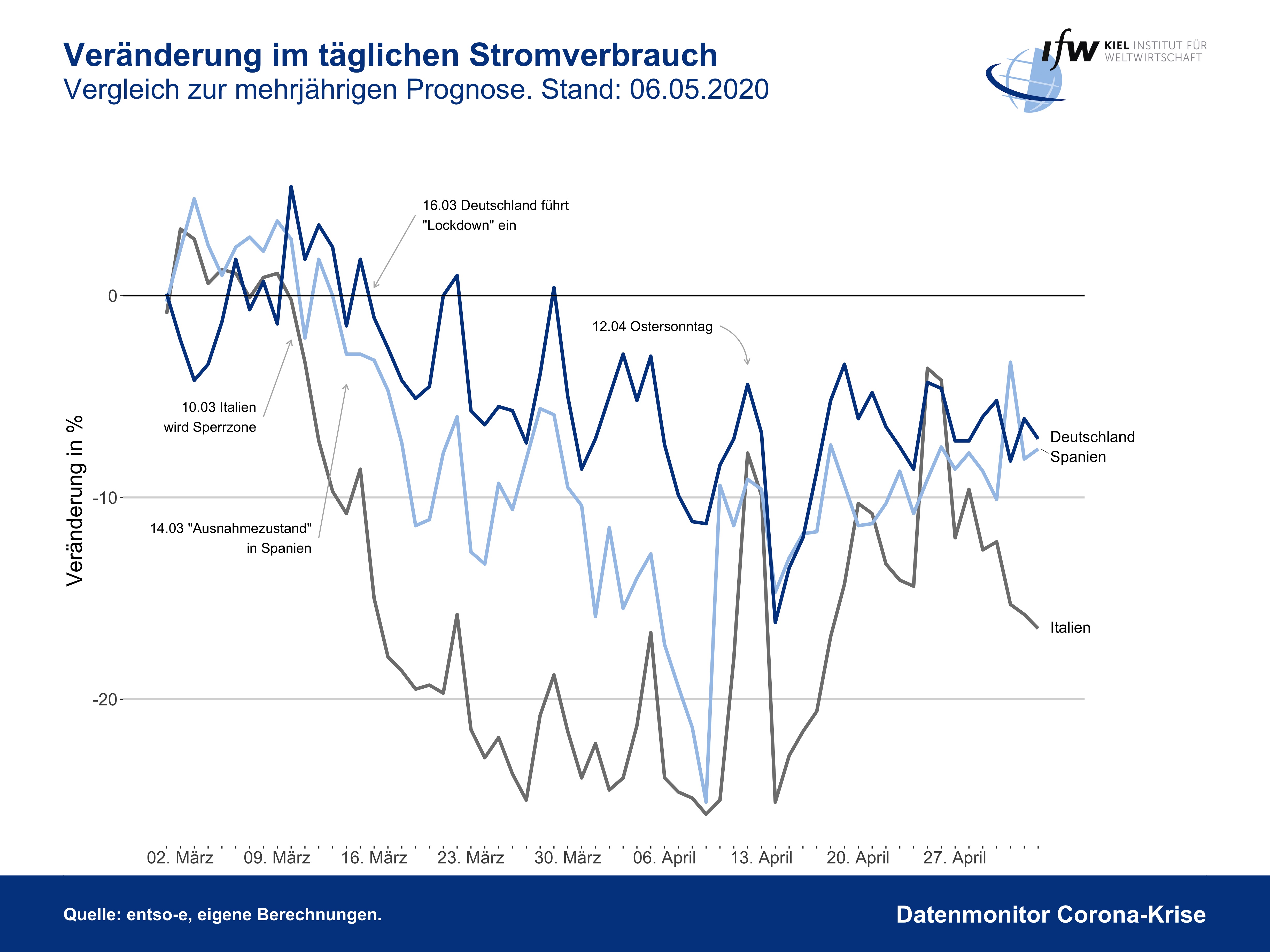In den besonders von der Corona-Pandemie betroffenen Ländern Italien und Spanien lag der Stromverbrauch in der Spitze um bis zu 25 Prozent unter dem Referenzniveau. Dies bedeutet einen Einbruch der dortigen Industrieproduktion von 35 bis 40 Prozent.