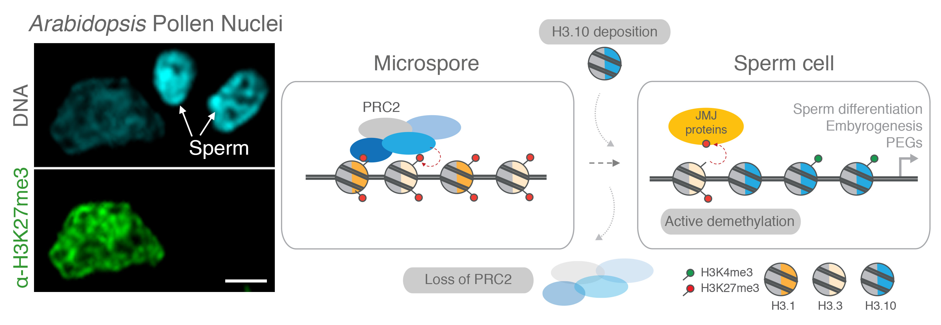 To answer this question, an international team lead by Dr. Michael Borg, a postdoc in the lab of Dr. Frédéric Berger at the Gregor Mendel Institute of the Austrian Academy of Sciences, set out to analyse histones in pollen, hypothesizing that the process of forgetting would most likely occur in the embedded sperm. The researchers were surprised to find that H3K27me3 completely disappeared in sperm. They found that sperm accumulate a special histone that is unable to carry H3K27me3. This ensures that this modification is erased from hundreds of genes, not only those that prevent flowering but also ones which control a large array of important functions in seeds, which are produced once the sperm is carried by the pollen to fuse with the plant egg cell. This phenomenon is called “epigenetic resetting” and is akin to erasing and reformatting data on a hard drive.