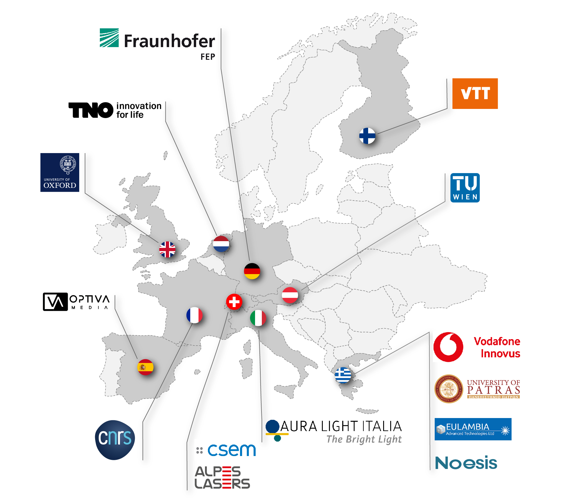 Das PeroCUBE-Konsortium (High-Performance Large Area Organic Perovskite devices for lighting, energy and Pervasive Communication) besteht aus den folgenden 14 Partnern: