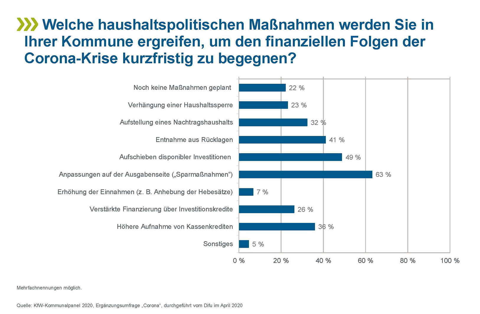 Auf diese sich abzeichnenden Herausforderungen reagiert laut Difu-Befragung rund ein Viertel der Kommunen mit der kurzfristigen Verhängung von Haushaltssperren. Ein Drittel bereitet bereits Nachtragshaushalte vor, um die finanziellen Folgen der Corona-Krise abzufangen. Dies dürfte bei ähnlich vielen Kommunen auch über eine höhere Verschuldung erfolgen. In 63 Prozent der Kommunen werden zudem Konsolidierungsmaßnahmen geplant.