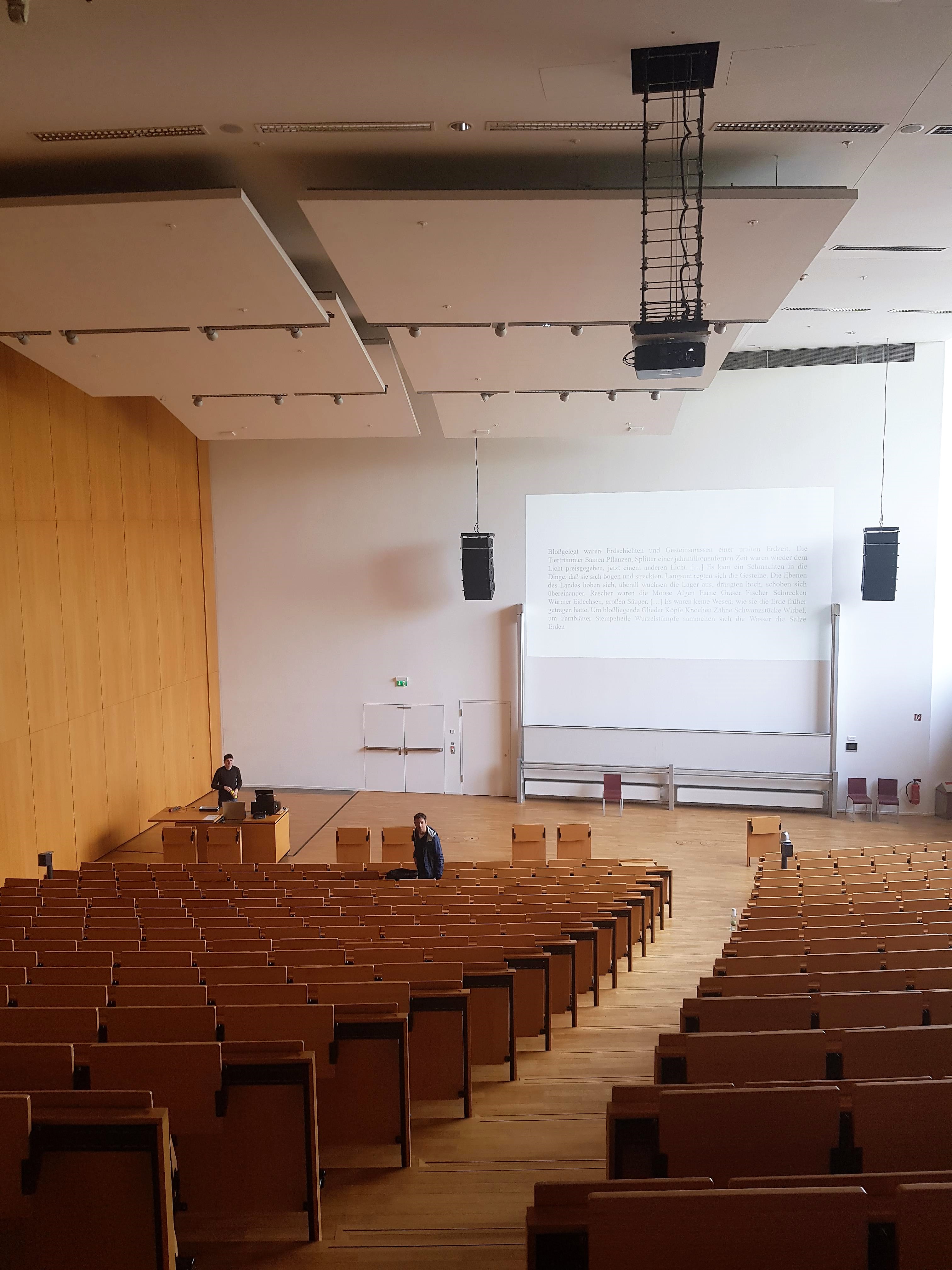 Geistervorlesung? Der Hörsaal ist fast leer, doch die Studierenden des neuen Orientierungsstudienganges beteiligen sich rege an den digitalen Angeboten der Goethe-Universität. (Fotos: Scheel)
