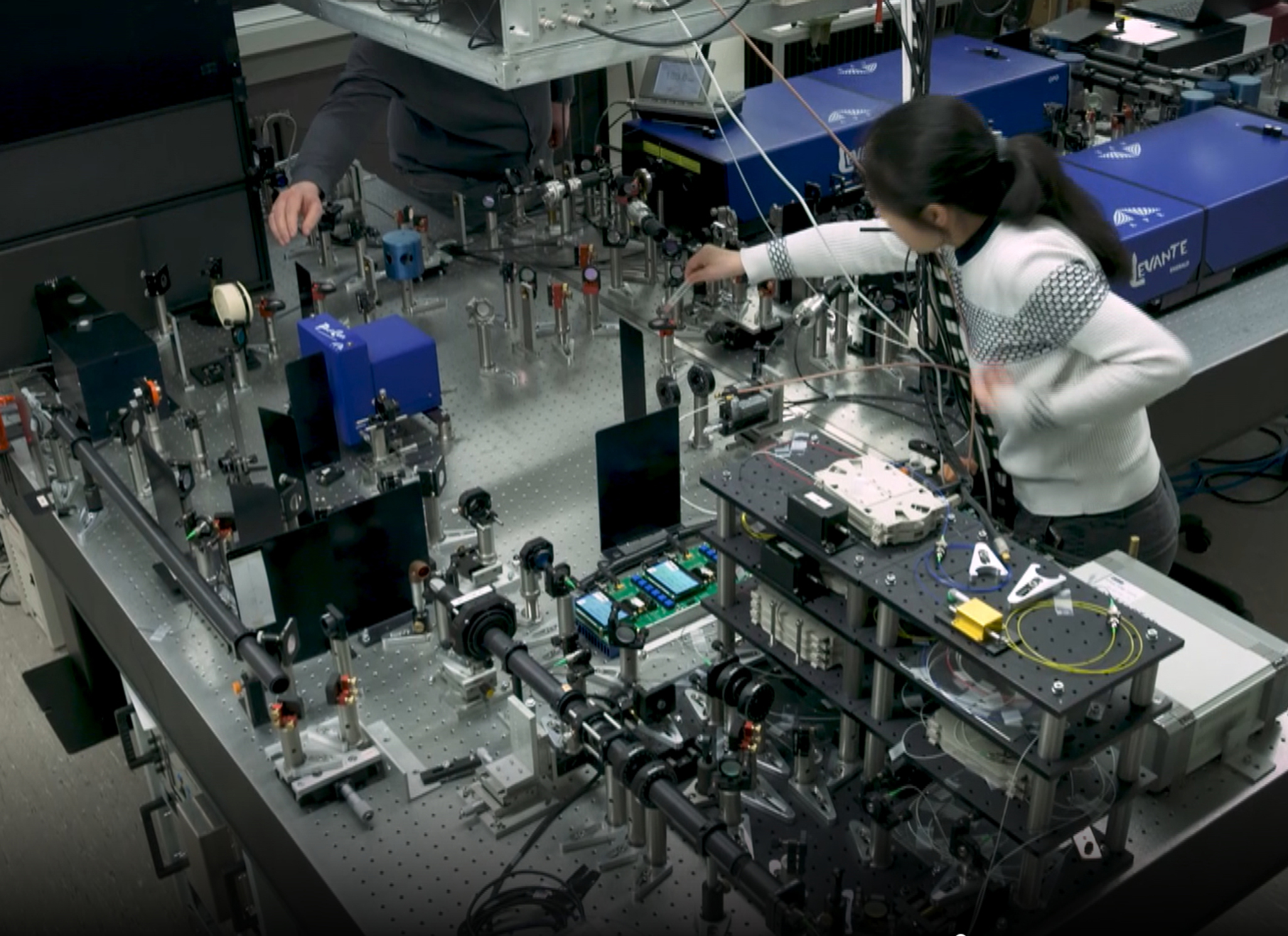 Faserlaser wurden in den vergangenen Jahren immer wieder für den Einsatz in optischen Nanomikroskopen erprobt. In ihnen wird das Licht durch Glasfasern geleitet, statt durch einen Festkörper aus Kristall oder Glas. „In Mikroskopen waren die Faserlaser bisher den Festkörperlasern aber unterlegen, weil sie weniger leistungsstark waren und die Intensität sehr verrauscht war“, erklärt Huser. Um in ihrem Mikroskop molekülspezifische Abbildungen zu erzielen, verwenden die Wissenschaftler*innen nicht einen, sondern zwei synchronisierte optische Resonatoren (Hohlräume mit Spiegeln). Aus ihnen treffen die Laserstrahlen auf die zu untersuchende Probe. Die beiden Laser senden ihre Strahlen in kurzen Pulsen von Pikosekunden. Eine Pikosekunde ist das Billionstel einer Sekunde. „Eine Herausforderung war, die beiden Laser so zu steuern, dass die Strahlen genau gleichzeitig durch eine Linse auf die Probe treffen“, sagt Thomas Huser.