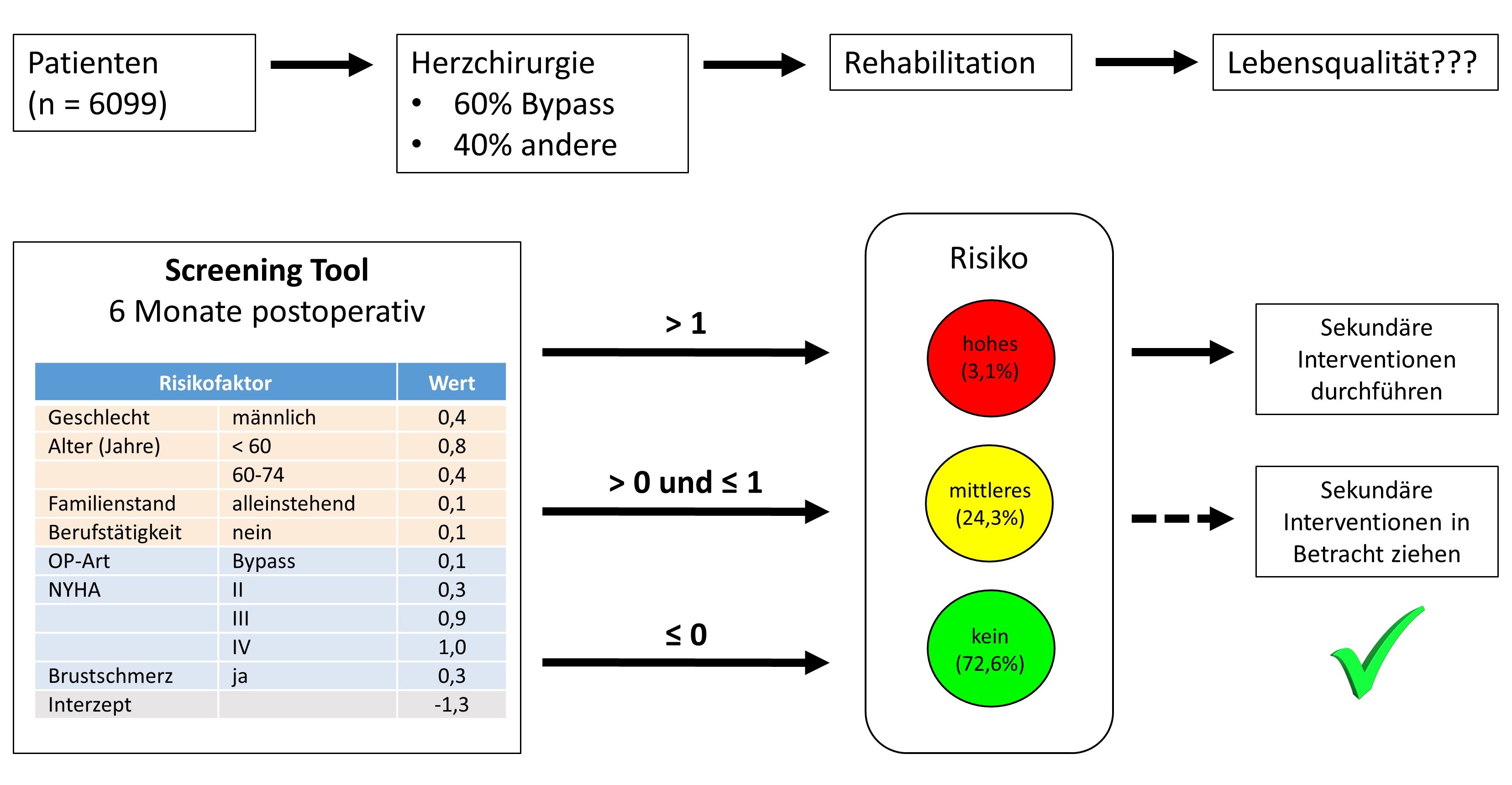 Es zeigte sich, dass klassische Beschwerden der Herzpatienten wie Atemnot und Brustschmerzen die postoperative Lebensqualität besonders schwer beeinflussen, wenn bestimmte sozioökonomische Faktoren hinzukommen. Männer, jüngere Patienten, Alleinstehende und Personen ohne geregelte Arbeit zeigen ein erhöhtes Risiko, dass ihre Lebensqualität postoperativ eingeschränkt ist im Vergleich zu denen nach Alter und Geschlecht vergleichbaren Gruppen der Allgemeinbevölkerung.
