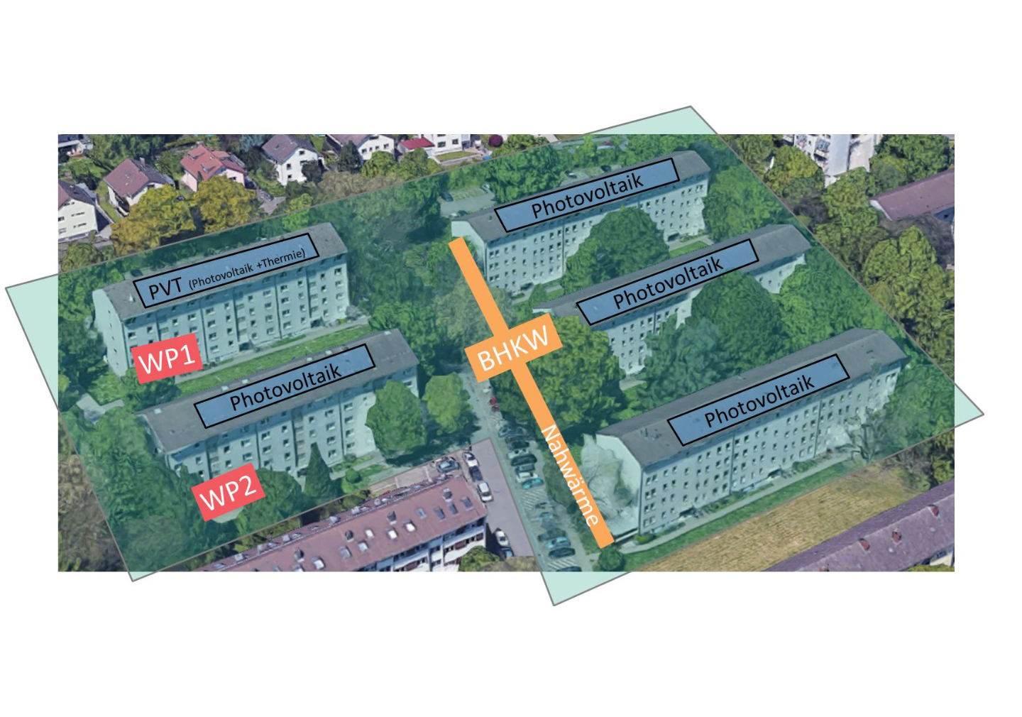 Das für die energetische Sanierung entwickelte Energiekonzept setzt auf die Kombination bewährter Technologien. So werden auf den Dächern aller Gebäude PV-Anlagen installiert. Drei der Gebäude sind mit einer Nahwärmeleitung verbunden, in die zwei Erdgas-BHKW-Aggregate Wärme einspeisen. Eine wesentliche Voraussetzung für die Umsetzung des Konzepts ist der Quartiersansatz, also die Vernetzung mehrerer Gebäude sowohl durch Austausch von Energie als auch einer übergreifenden Betriebsführung und Regelung.