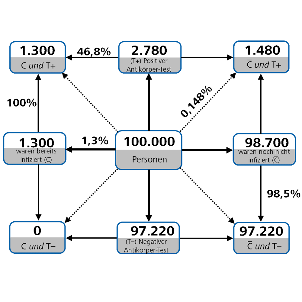 Viele Menschen (selbst Ärztinnen und Ärzte) lassen sich von solch beeindruckenden Zahlen täuschen, was in manchen medizinischen Diagnosefällen auch zu unnötigen Operationen an gesunden Personen führen kann (z. B. eine Amputation der Brust nach einer falschen Diagnose von Brustkrebs). Entscheidend für die Güte medizinischer Tests ist jedoch noch eine weitere Zahl: Wie groß ist denn der Anteil der Personen in der Bevölkerung, die bereits eine Infektion durchgemacht haben? Die Abbildung zeigt eine Beispielrechnung, in der bereits 1,3 Prozent der Bevölkerung die Infektion durchgemacht haben. Da viele Studien zeigen konnten, dass all diese statistischen Informationen besser verstanden werden, wenn man sich konkrete Personen vorstellen kann, werden in den Knoten des Netzes absolute Häufigkeiten dargestellt: Von 100.000 Personen in der Bevölkerung sind in der Beispielrechnung 98.700 noch nicht mit Sars-CoV-2 infiziert, während 1.300 bereits eine Infektion durchgemacht haben (dies entspricht den 1,3 Prozent). Die Sensitivität von 100 Prozent würden dementsprechend bedeuten, dass all diese 1.300 Personen, die bereits infiziert waren, einen positiven Befund im Antikörper-Test erhalten und es keine Person gibt, die einen negativen Befund erhält. Die Spezifität von 98,5 Prozent bedeutet hingegen, dass von den 98.700 Personen, die noch nicht infiziert waren, dennoch fälschlicherweise 1.480 Personen einen positiven Antikörper-Befund erhalten. Die 98,5 Prozent hörten sich im ersten Moment gut an. Doch dadurch, dass es so viel mehr nicht-infizierte als bereits infizierte Personen gibt, resultieren immer noch viele positive Testergebnisse, die nur fälschlicherweise positiv sind. Von insgesamt 2.780 Personen mit positivem Antikörper-Befund waren nur 1.300 Personen in der Beispielrechnung auch tatsächlich infiziert. Nur 46,8 Prozent der positiven Testergebnisse sind demnach richtig.