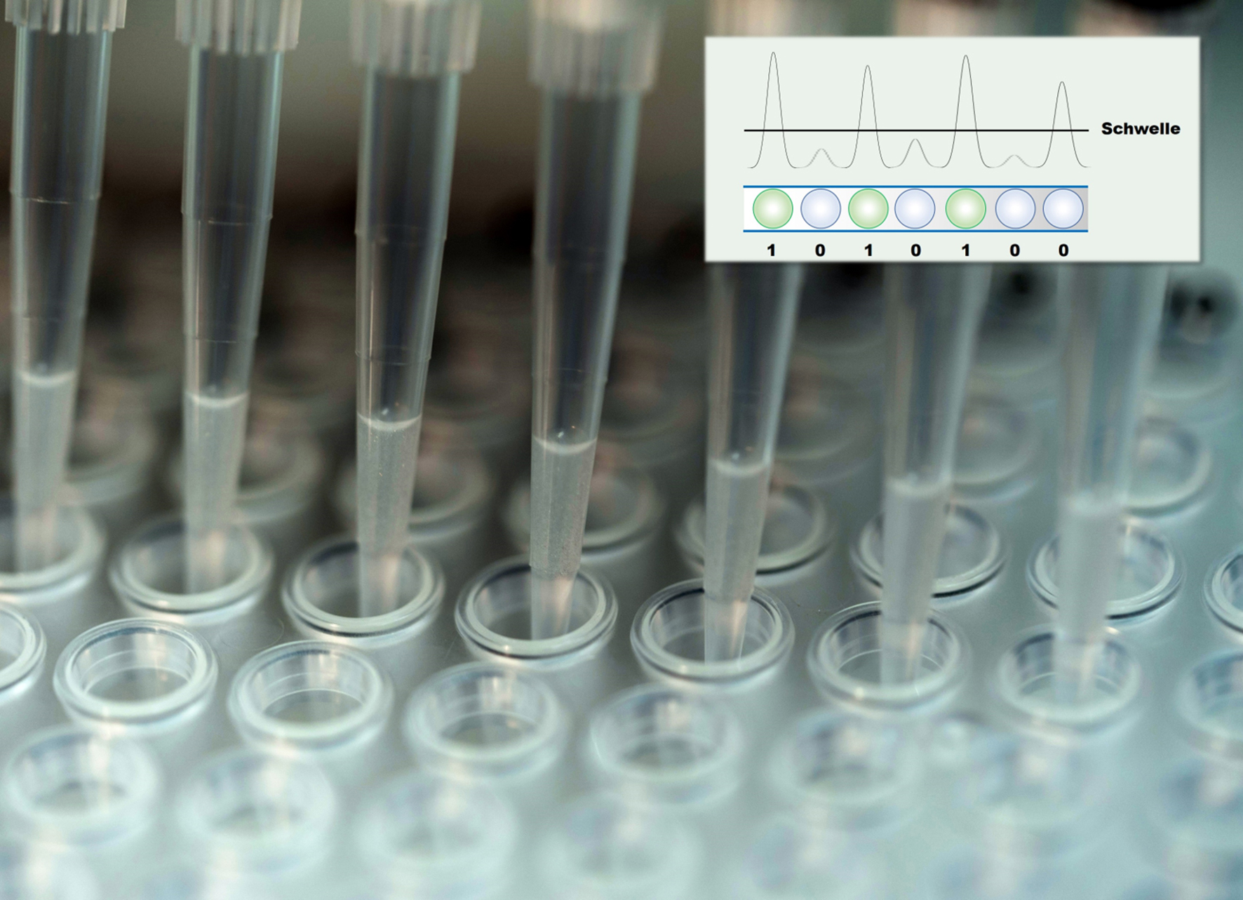 Multipipette beim Befüllen einer Multiwell-Platte. Kleine Grafik: Schema der Digitalisierung von Nukleinsäurefragmenten bei der digitalen Tröpfchen-Polymerase-Kettenreaktion (ddPCR). Befindet sich in den Tröpfchen die gesuchte RNA-Sequenz, wird sie darin vervielfältigt und über ein simultan mit der Vervielfältigung erhöhtes Fluoreszenzsignal detektiert. Nur Tröpfchen mit erhöhtem Fluoreszenzsignal (hier grün dargestellt) werden gezählt. (Abbildung: PTB)