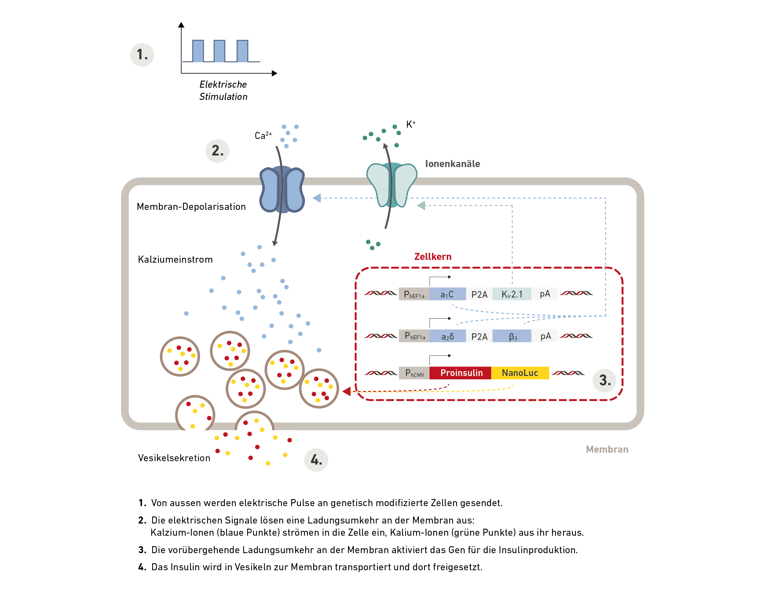 Ein Funksignal von ausserhalb des Körpers aktiviert die Elektronik im Implantat, diese überträgt elektrische Signale direkt an die Zellen. Die elektrischen Signale stimulieren eine spezielle Kombination von Kalzium- und Kaliumkanälen, welche eine Signalkaskade in der Zelle aktiviert, welche das Insulin-Gen steuert. Die Zellmaschinerie verpackt das Insulin in Vesikeln, die durch das elektrische Signal mit der Zellmembran verschmelzen und so das Insulin innerhalb weniger Minuten freisetzen.