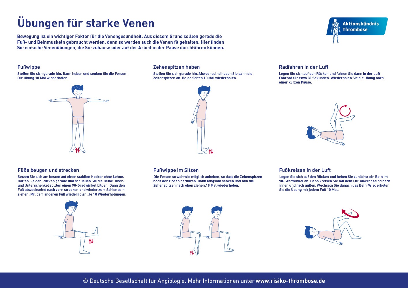 Das Aktionsbündnis Thrombose hat eine Übersicht mit einfachen Übungen wie der "Fußwippe" oder "Zehenspitzen heben" anschaulich aufbereitet und zum kostenlosen Download auf der Website https://www.risiko-thrombose.de/ bereitgestellt.