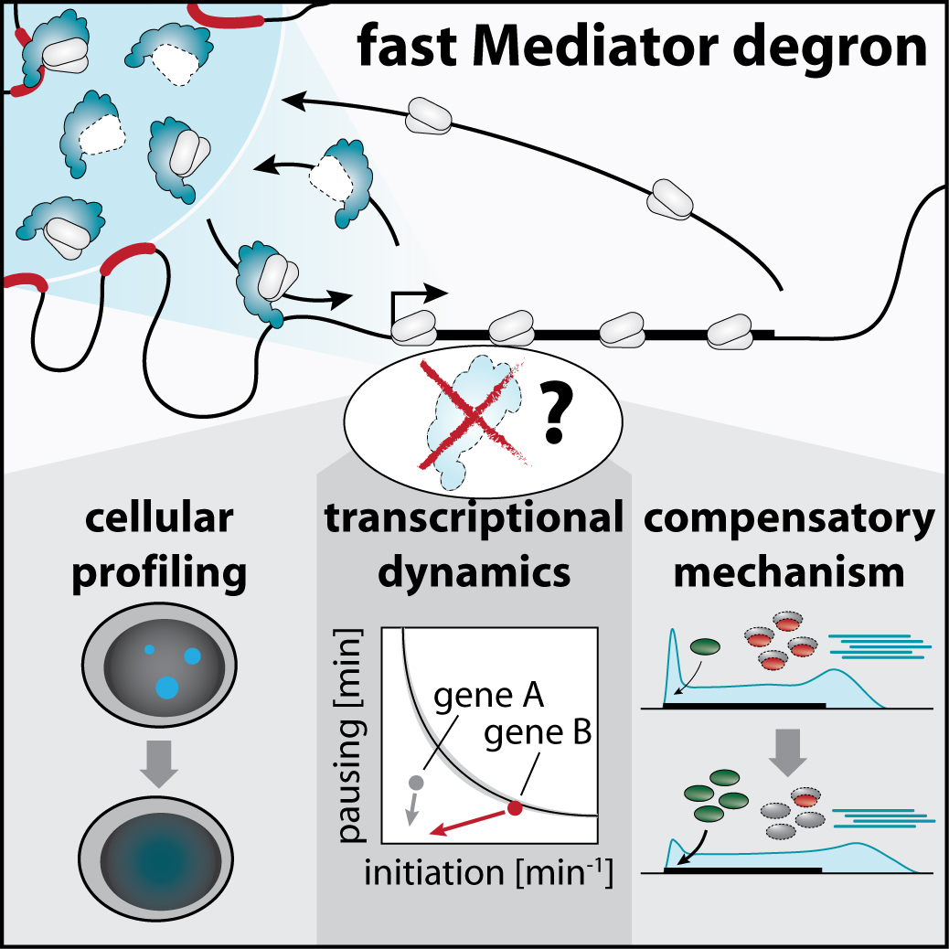 Durch Einfärben und Sichtbarmachen von Pol II Enzymen in Zellen konnte das Team zeigen, dass der Mediatorkomplex die Transkriptionsmaschinerie in große Cluster organisiert, die sich laut jüngster Forschungsergebnisse um regulatorische DNA-Sequenzen, sogenannte Super-Enhancer bilden. Diese Super-Enhancer stimulieren die Expression zelltypspezifischer Gene, indem sie ihre oft Millionen von DNA-Basen entfernten Zielgene physisch berühren. Die großen Pol II Cluster verschwanden sehr rasch nach dem gezielten Abbau von Mediator, allerdings scheinen die Super-Enhancer ihre Zielgene immer noch zu berühren. Dies weist darauf hin, dass diese DNA-Kontakte auch ohne Mediator aufrechterhalten werden können. Allerdings konnte das Team am CeMM gemeinsam mit Experten aus Cramers Labor beobachten, dass sich die Dynamik des Transkriptionsprozesses bei Genen mit Super-Enhancer-Antrieb nach dem Verlust von Mediator dramatisch verändert. Die Daten legen nahe, dass Mediator-Cluster Pol II-Enzyme gezielt in die Nähe dieser zelltypspezifischen Gene locken, um damit das Kopieren dieser Gene mit großer Effizienz voranzutreiben. Gleichzeitig schien die Mehrheit der übrigen Gene von einem akuten Mediatorverlust überraschend wenig betroffen zu sein, was die Wissenschaftler vermuten ließ, dass diese einen unerwarteten kompensatorischen Schub erfahren hatten.