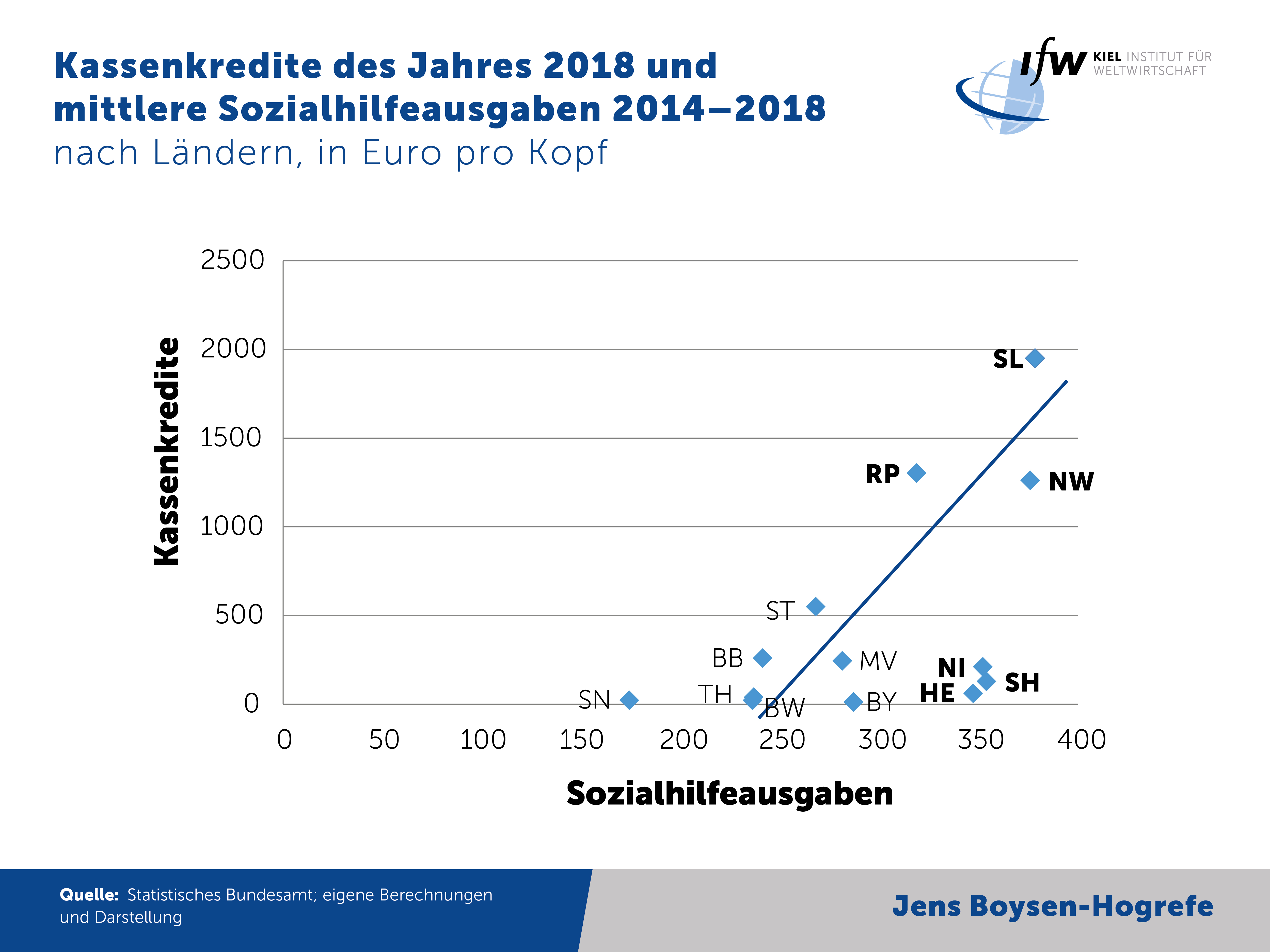 Eine schwache Sozialstruktur und in der Folge hohe Sozialausgaben der Kommunen alleine können den hohen Schuldenstand aber nicht erklären. In den Ländern Hessen, Niedersachsen und Schleswig-Holstein liegen zum Beispiel die Ausgaben für die Sozialhilfe in vergleichbarer Höhe, die kommunalen Schulden pro Kopf sind aber verhältnismäßig gering mit 211 Euro (NI), 129 Euro (SH) und 62 Euro (HE). Dies zeigt eine Analyse des IfW-Haushaltsexperten Jens Boysen-Hogrefe (Warum Schleswig-Holstein die Pläne von Olaf Scholz zur Übernahme von Altschulden durch den Bund in der ursprünglichen Form ablehnen sollte: https://www.ifw-kiel.de/index.php?id=14583&L=1).