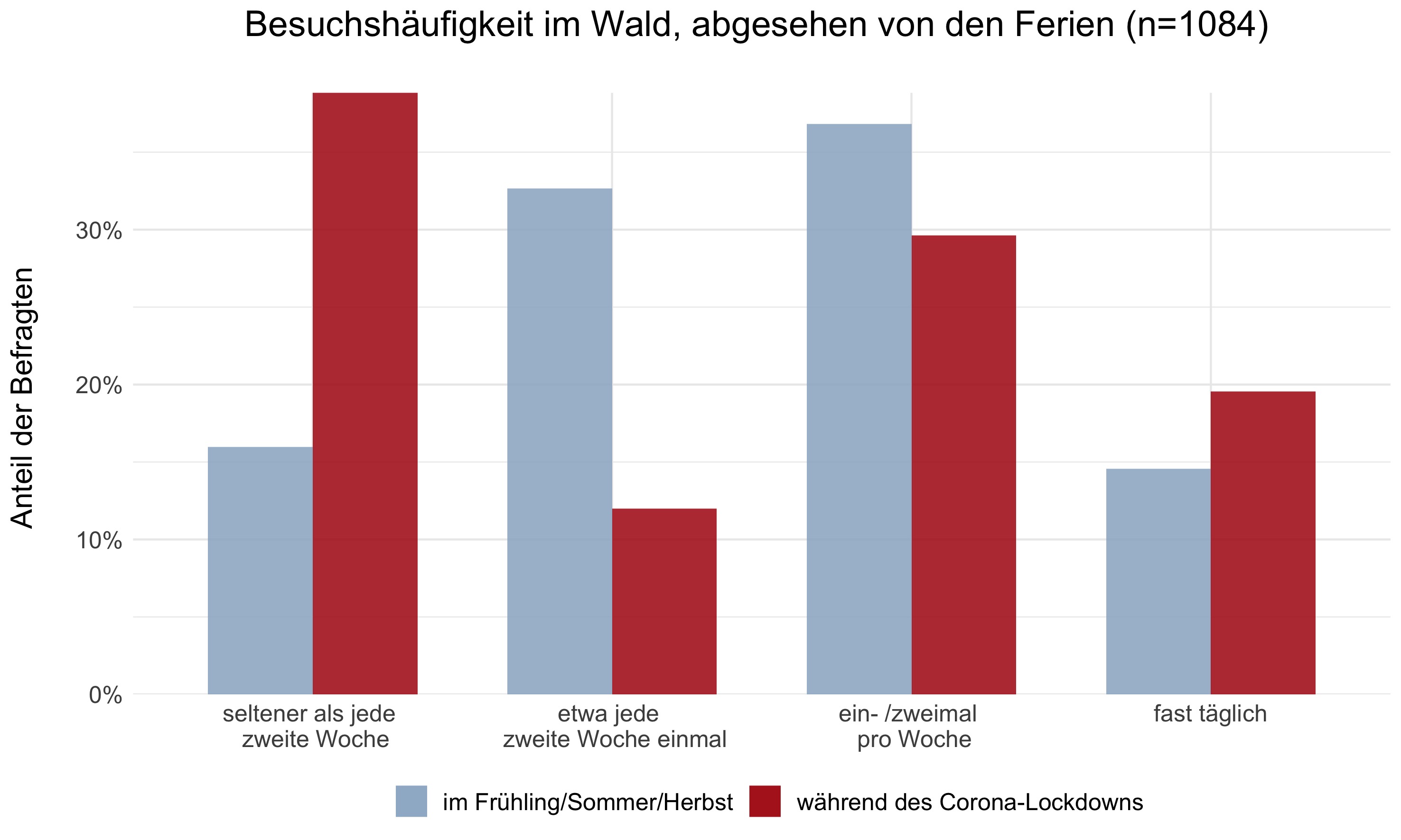 Aufgrund des frühlingshaften Wetters Anfang April verglichen die Forschenden die Aussagen der Befragten zur Häufigkeit ihrer Waldbesuche in den ersten Wochen des Lockdowns mit deren Angaben dazu, wie häufig sie üblicherweise in der wärmeren Jahrezeit in den Wald gehen. Dabei fiel auf, dass sich die Häufigkeit der Waldbesuche in zwei Richtungen verändert hatte: Sehr viele Personen gingen deutlich seltener in den Wald als normalerweise in der wärmeren Saison, viele aber auch deutlich häufiger. Gesunken hingegen war die Zahl der «gelegentlichen» Waldbesucher (siehe Grafik). Darüber hinaus zeigte sich auch, dass Waldbesuche während des Lockdowns im Durchschnitt kürzer ausfielen und näher zum Wohnort stattfanden als üblich.