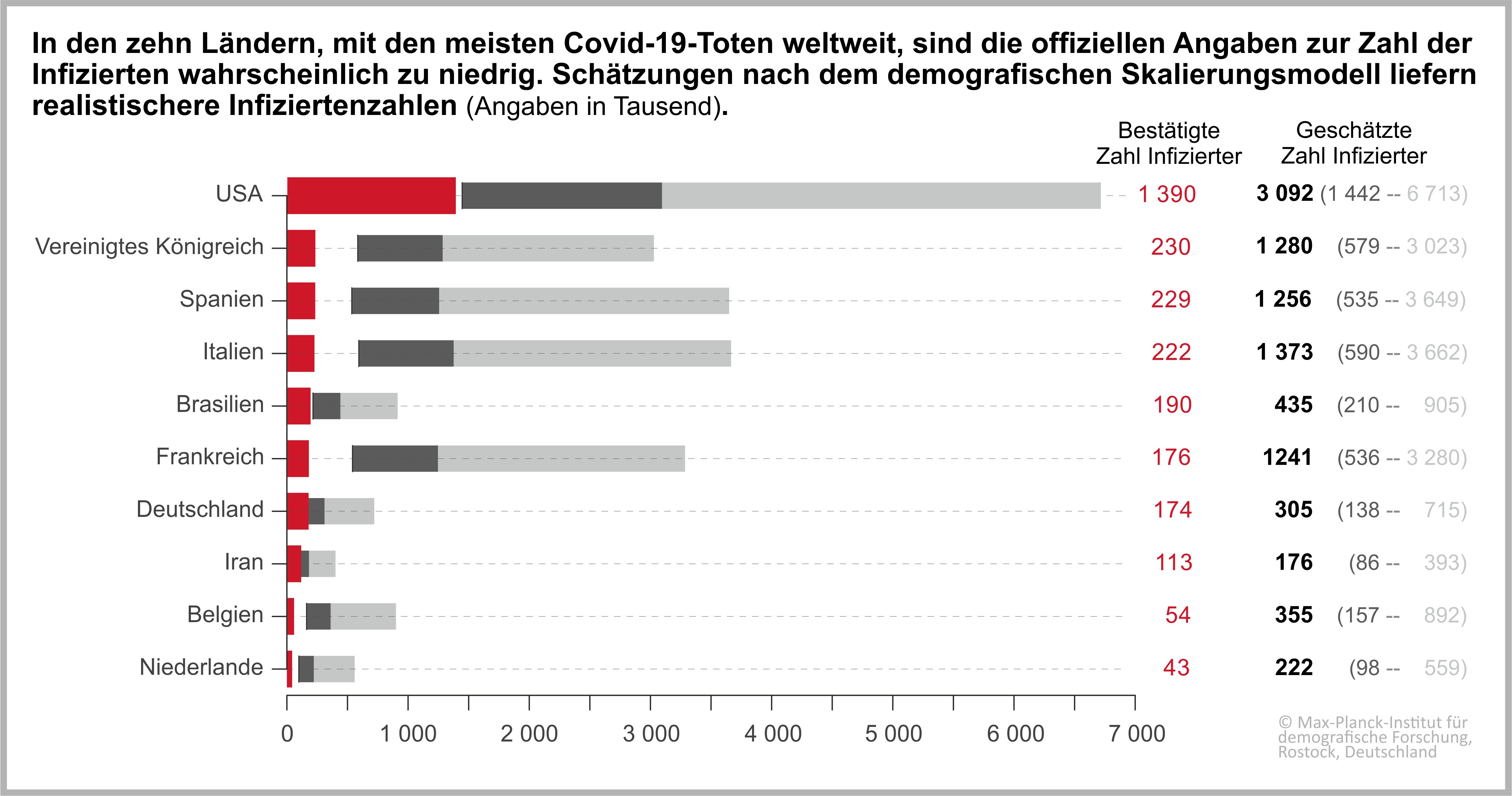 Rostock. „Für die zehn am meisten von der Covid-19-Pandemie betroffenen Länder schätzen wir mit unserem demografischen Skalierungsmodell ab, wie hoch die Dunkelziffer infizierter Personen ist“, sagt Mikko Myrskylä, Direktor am Max-Planck-Institut für demografische Forschung. So gebe es dort nach Stand der Zahlen vom 13. Mai 2020 durchschnittlich vier Mal so viele Infizierte, wie bestätigte Fälle.