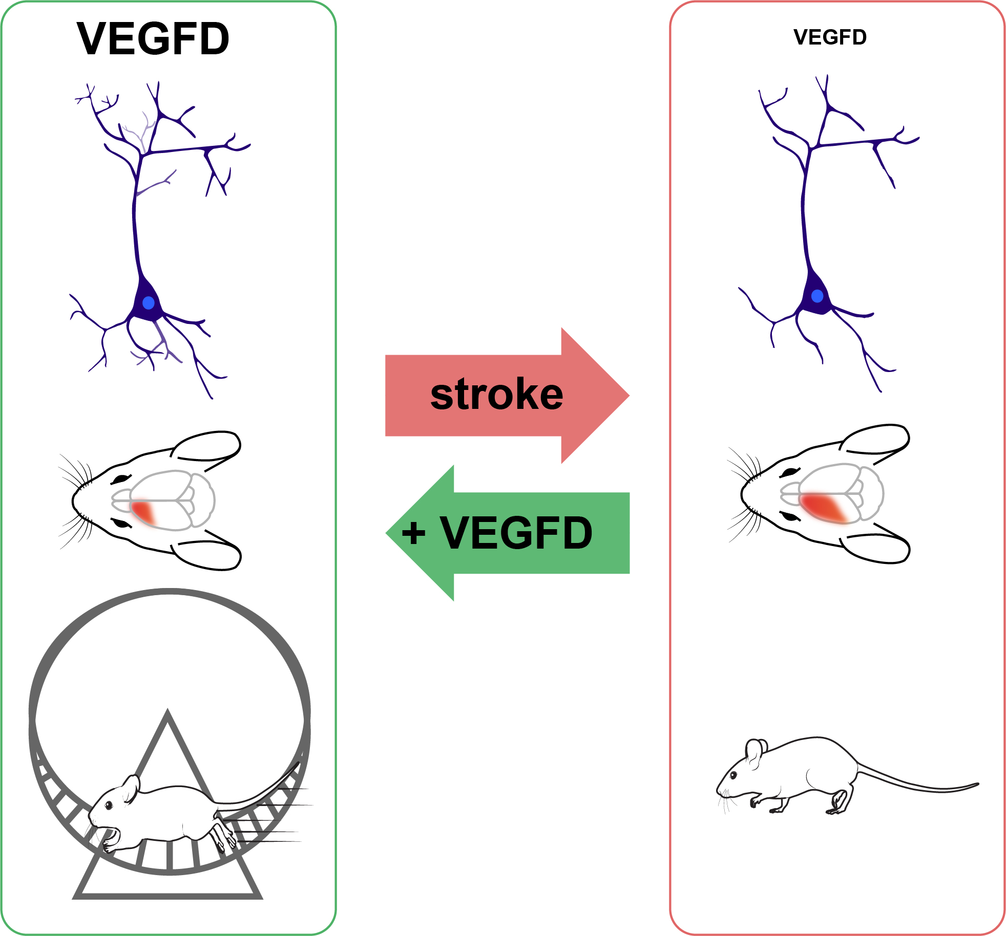 Bilderläuterung "Illustration_1": Ein Schlaganfall führt zur Reduktion der VEGFD-Level, dem Verlust von Dendriten, Hirnschäden und Einschränkungen der motorischen Funktionen. Wie Forschungen am Mausmodell gezeigt haben, können VEGFD-basierte Therapien den strukturellen Zerfall verhindern und so die funktionelle Wiederherstellung erleichtern.