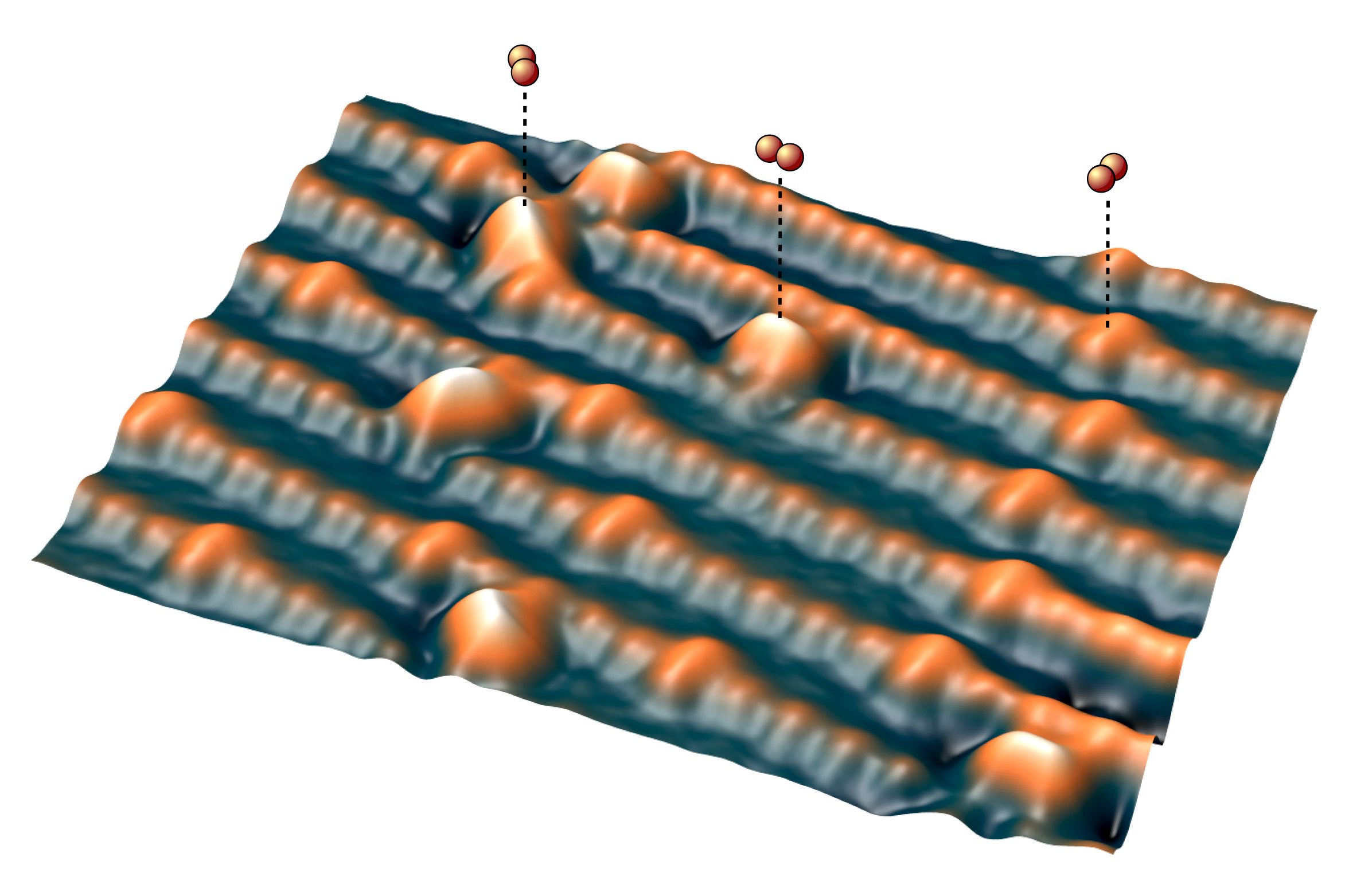 Leider ist es nicht einfach, ein Bild von diesen Atomen aufzunehmen. Oft werden Rastertunnelmikroskope eingesetzt, um Oberflächen Atom für Atom abzubilden. Dabei führt man eine feine Spitze in minimalem Abstand über die Probe, sodass einzelne Elektronen zwischen Probe und Spitze überwechseln können. Gemessen wird der elektrische Strom, der dabei fließt. Diese Methode lässt sich in diesem Fall allerdings nicht einsetzen – die Sauerstoffmoleküle würden elektrisch aufgeladen werden und dadurch ihr Verhalten völlig verändern.