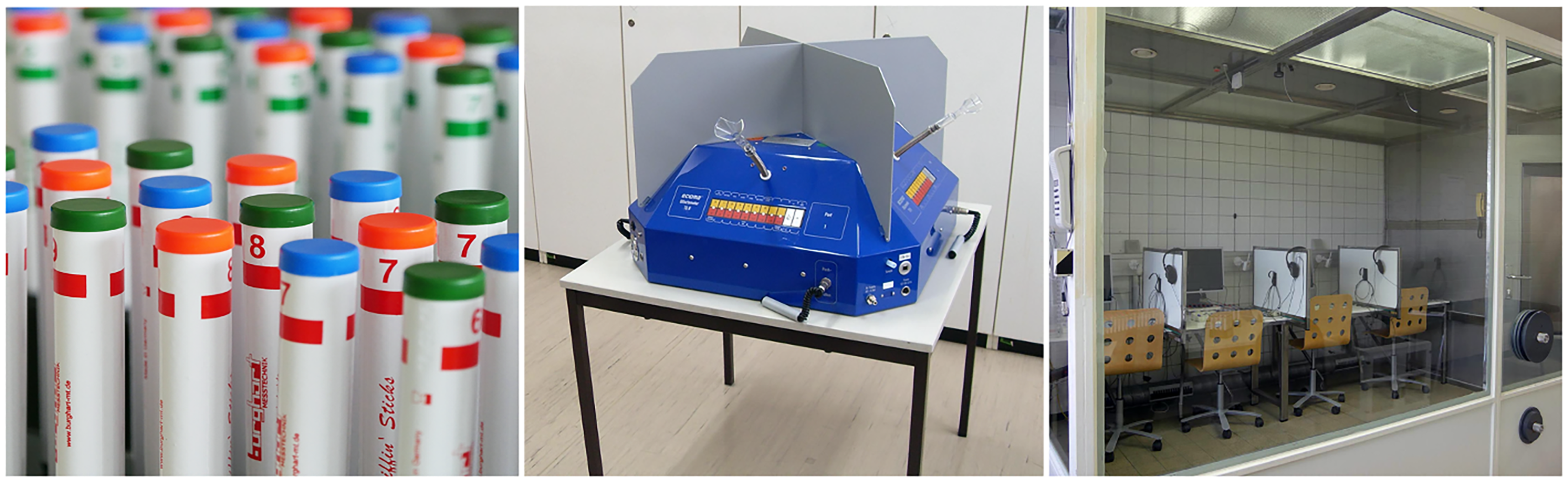 In der aktuellen IfADo-Studie wurde die n-Butanol-Geruchsschwelle von 35 Testpersonen ermittelt. Die Forschenden haben die zwei in der Praxis gängigen Verfahren eingesetzt: Riechstifte (Sniffin‘ Sticks) und ein Riechgerät, das sogenannte Olfaktometer (s. Foto). Die Riechstifte enthalten Duftstoffe unterschiedlicher Konzentration. Testpersonen müssen jeweils immer wieder den einen von drei Stiften erkennen, der nach n-Butanol riecht. Im Olfaktometer wird n-Butanol hingegen unterschiedlichen stark verdünnt präsentiert, bis die Person eine bestimmte Konzentration wiederholt wahrnimmt. Beide Verfahren nähern sich der individuellen Geruchsschwelle also durch richtige bzw. falsche Antworten der Testperson an.