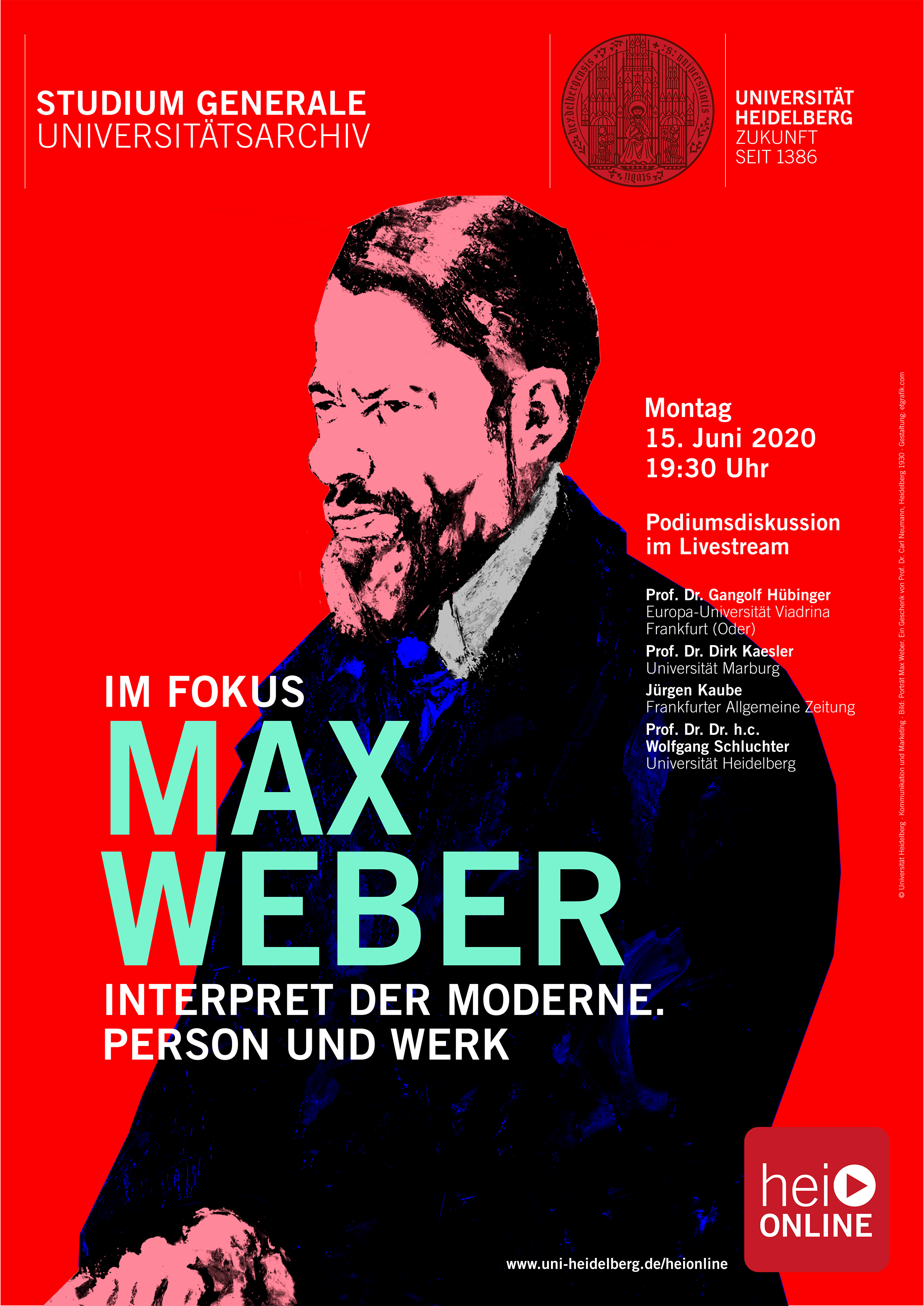 Aus Anlass seines 100. Todestages steht der als einer der Gründerväter der deutschen Soziologie noch heute einflussreiche Max Weber im Mittelpunkt des Studium Generale, das die Universität Heidelberg im Sommersemester 2020 im digitalen Format veranstaltet. Die Reihe trägt den Titel „Entfesselt: Kapitalismus, Religion und Demokratie“ und thematisiert die breite wissenschaftliche Rezeption Webers. Insbesondere biographischen Fragestellungen stehen im Mittelpunkt der ursprünglich im Universitätsarchiv geplanten Tagung „Max Weber in Heidelberg“. Die Vorträge im Rahmen des Studium Generale und die Beiträge der Tagung werden aufgezeichnet und sind dann über heiONLINE abrufbar. Das zentrale Portal der Ruperto Carola versammelt Vorträge, Diskussionsrunden und Podcasts, die sich an die Öffentlichkeit wenden und aktuell in Online-Formaten angeboten werden.