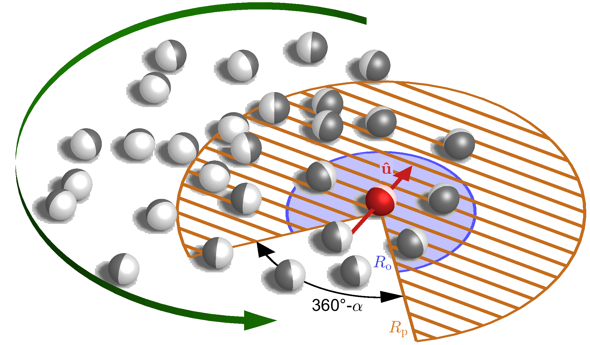 Bildunterschrift: Um einen Wirbel zu formieren, muss ein aktiver Partikel (rot) die Positionen und Ausrichtungen seiner Nachbarn innerhalb seines „Gesichtsfelds“ erfassen und sich entsprechend bewegen.