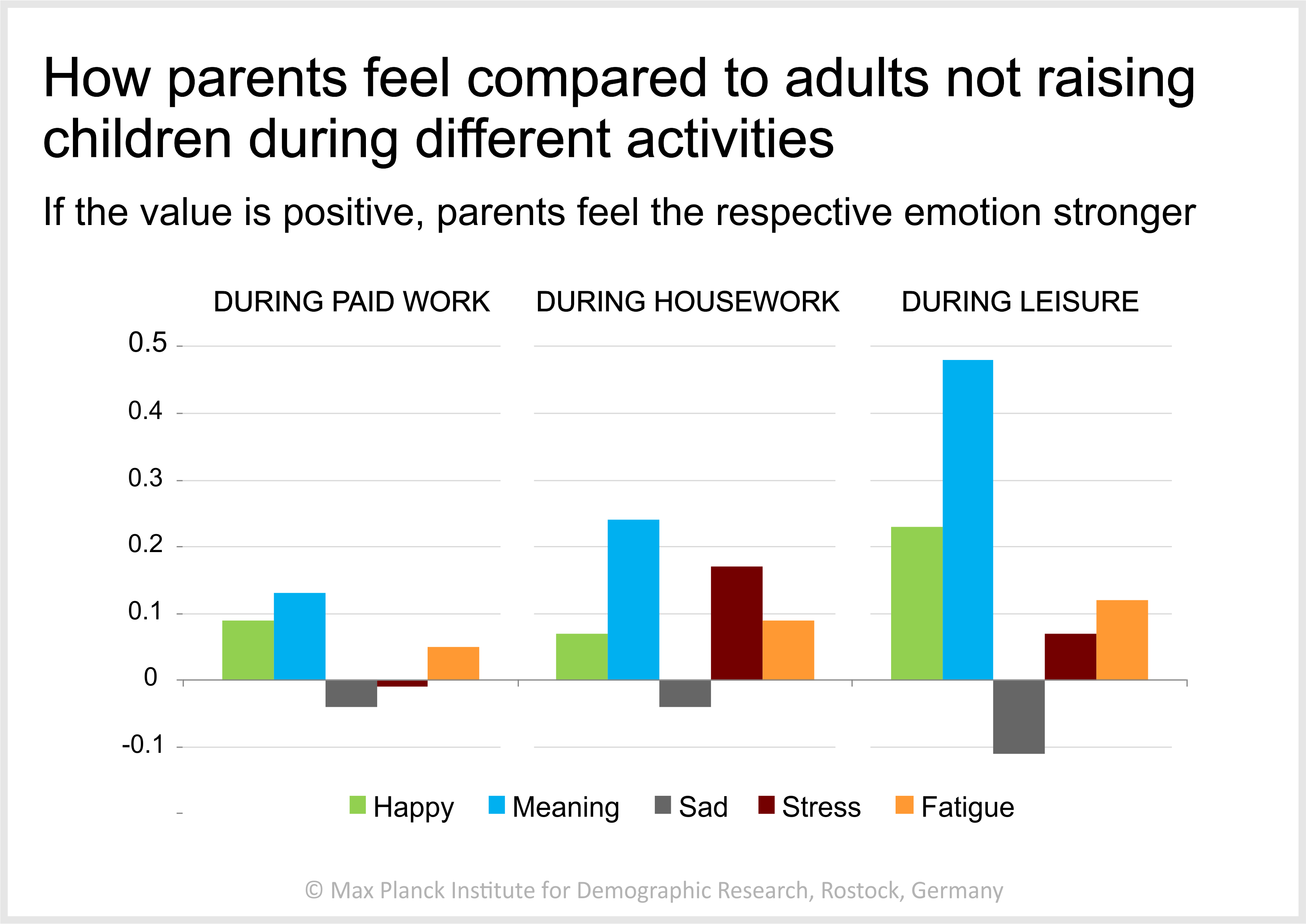 Negraia and her colleague found that parents feel more positive emotions like happiness and meaning than adults not raising children especially when they spend time with their children; that is, in their leisure time and during housework. At work, parents generally do not feel any different than non-parents.