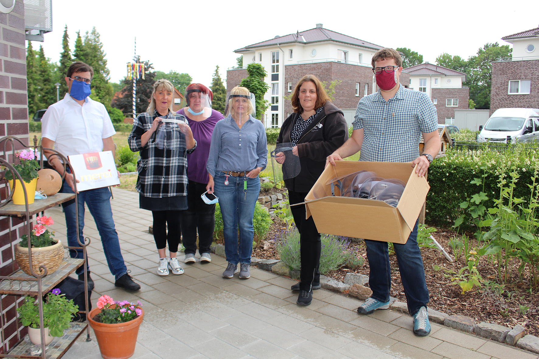 Die Pflegerin Martina Ebeling hat aus der Presse vom Engagement des Labors erfahren. Sie wandte sich an die Laboringenieurin Stefanie Wibbeler und schilderte ihr die Lage in der Pflegeeinrichtung: „Seit zweieinhalb Monaten sind wir in Kurzarbeit, viele im Team sind alleinerziehend und deshalb auch Alleinverdienerinnen. Von Gesichtsschilden erhoffen wir uns zusätzlichen Schutz und auch mehr Tragekomfort.“ Nach wenigen Wochen hielten die Mitarbeiterinnen der Tagespflege Atterhof ihre Spende in der Hand. „Wir sind dem Hochschulteam sehr dankbar für diese tolle Hilfe“, sagt Susanne Kandelhardt: „Auch für unsere Seniorinnen und Senioren ist das eine große Unterstützung: Viele hören nicht mehr gut und lesen von den Lippen. Außerdem können wir nun wieder unser ganzes Gesicht zeigen, was die nonverbale Kommunikation und das Miteinander sicher erleichtert.“