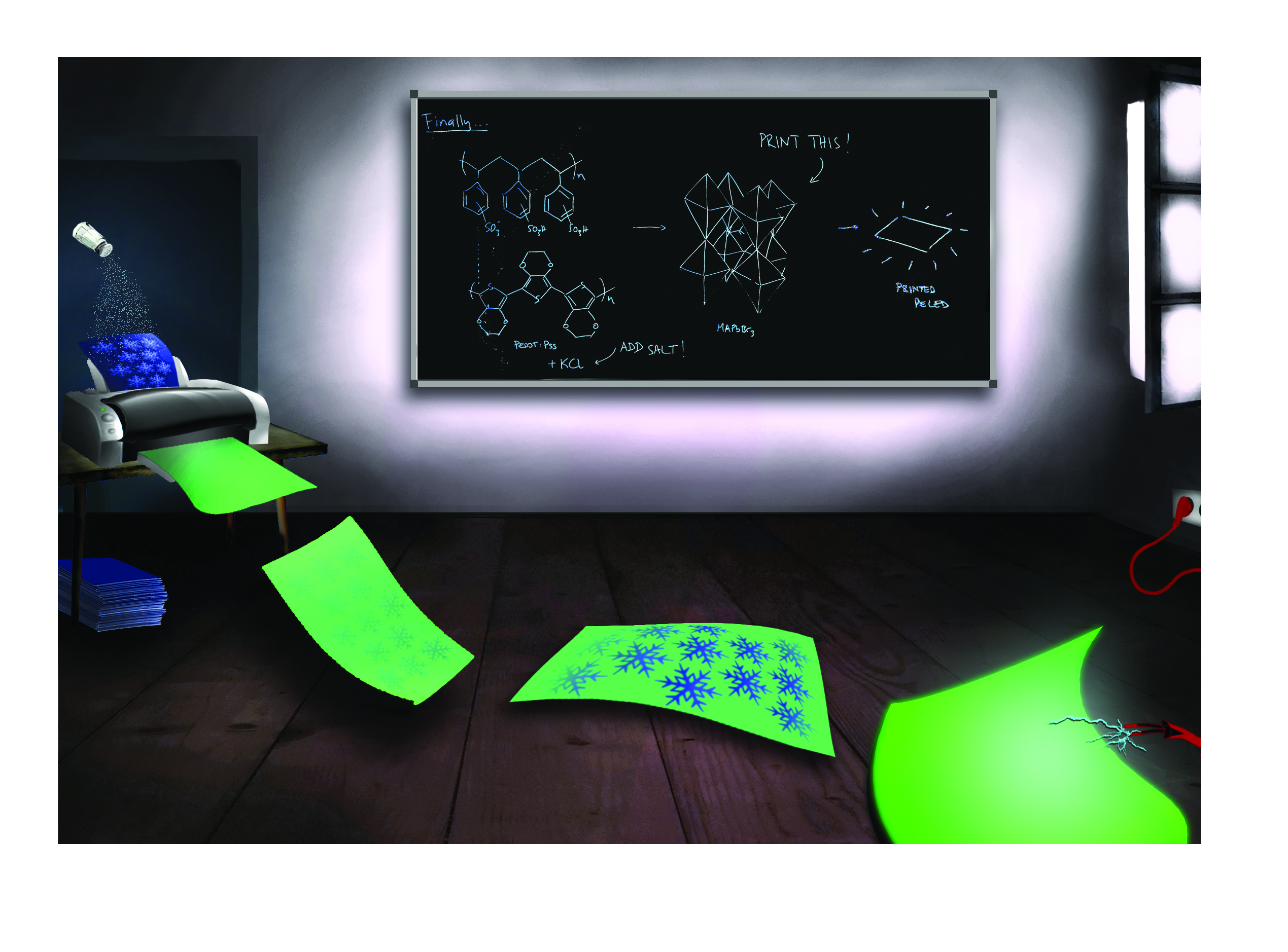 Einem Team von Forschern des HZB und der Humboldt-Universität zu Berlin ist es zum ersten Mal gelungen, Leuchtdioden (LEDs) aus einem hybriden Perowskit-Halbleitermaterial per Tintenstrahldruck herzustellen. Das Tor zu einer breiten Anwendung solcher Materialien in vielerlei elektronischen Bauelementen ist damit geöffnet. Der Durchbruch gelang den Wissenschaftlern mithilfe eines Tricks: dem „Impfen“ der Oberfläche mit bestimmen Kristallen.