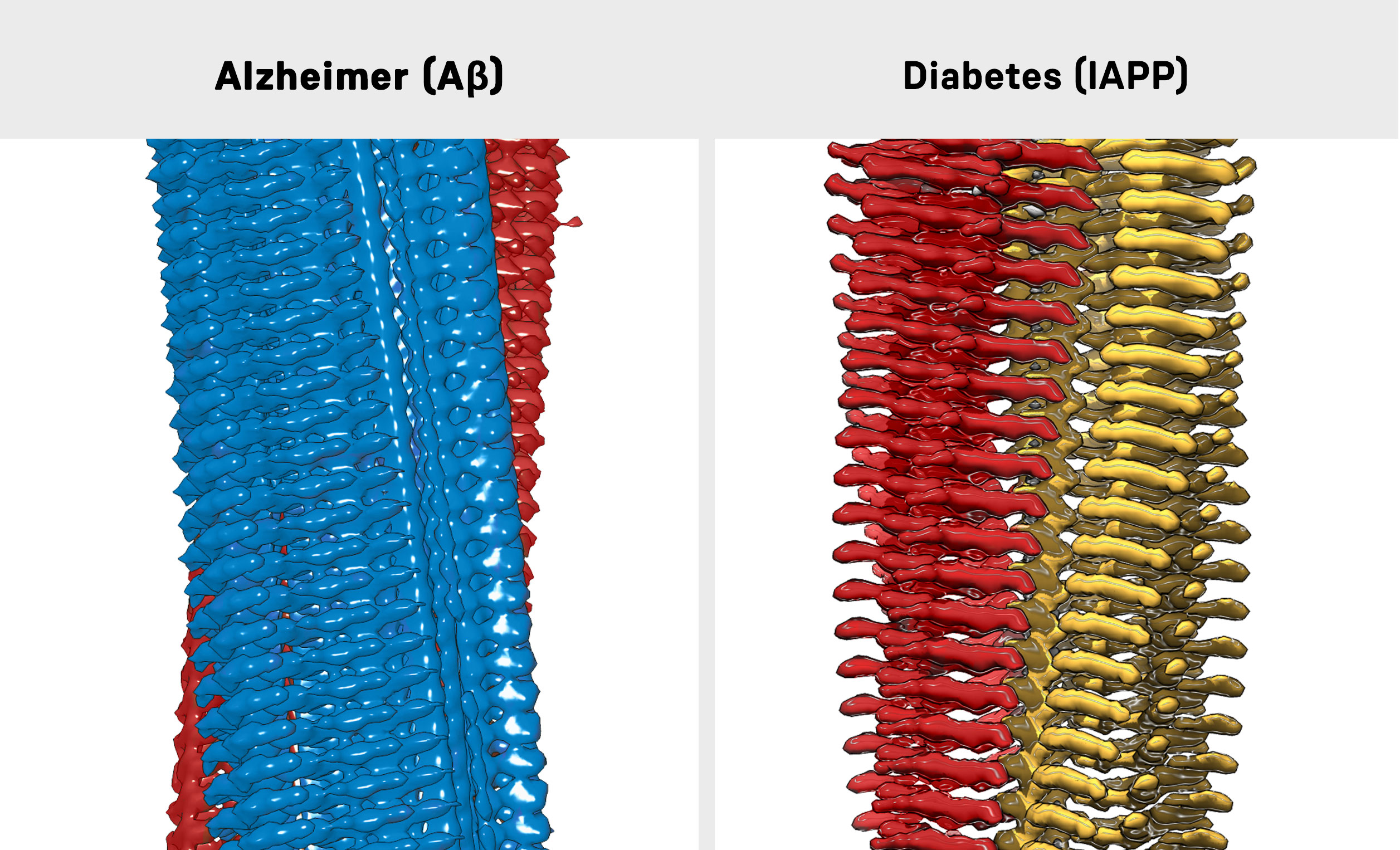 Krankhaft verklumpte Eiweiße sind für eine ganze Reihe von Erkrankungen charakteristisch, unter anderem Alzheimer, Parkinson und der verbreitete Typ-2-Diabetes. Wissenschaftler des Forschungszentrums Jülich, der Heinrich-Heine-Universität Düsseldorf und der Universität Maastricht haben mittels Kryo-Elektronenmikroskopie nun erstmals ein scharfes Bild davon erhalten, wie sich einzelne Moleküle in den Proteinfäden anordnen, aus denen die Diabetes-typischen Ablagerungen bestehen. Die Struktur der Fasern in den sogenannten Fibrillen erinnert stark an die von Alzheimer-Fibrillen. Das Ergebnis steht im Einklang mit weiteren Gemeinsamkeiten, die Forscher in den letzten Jahren herausgefunden haben.