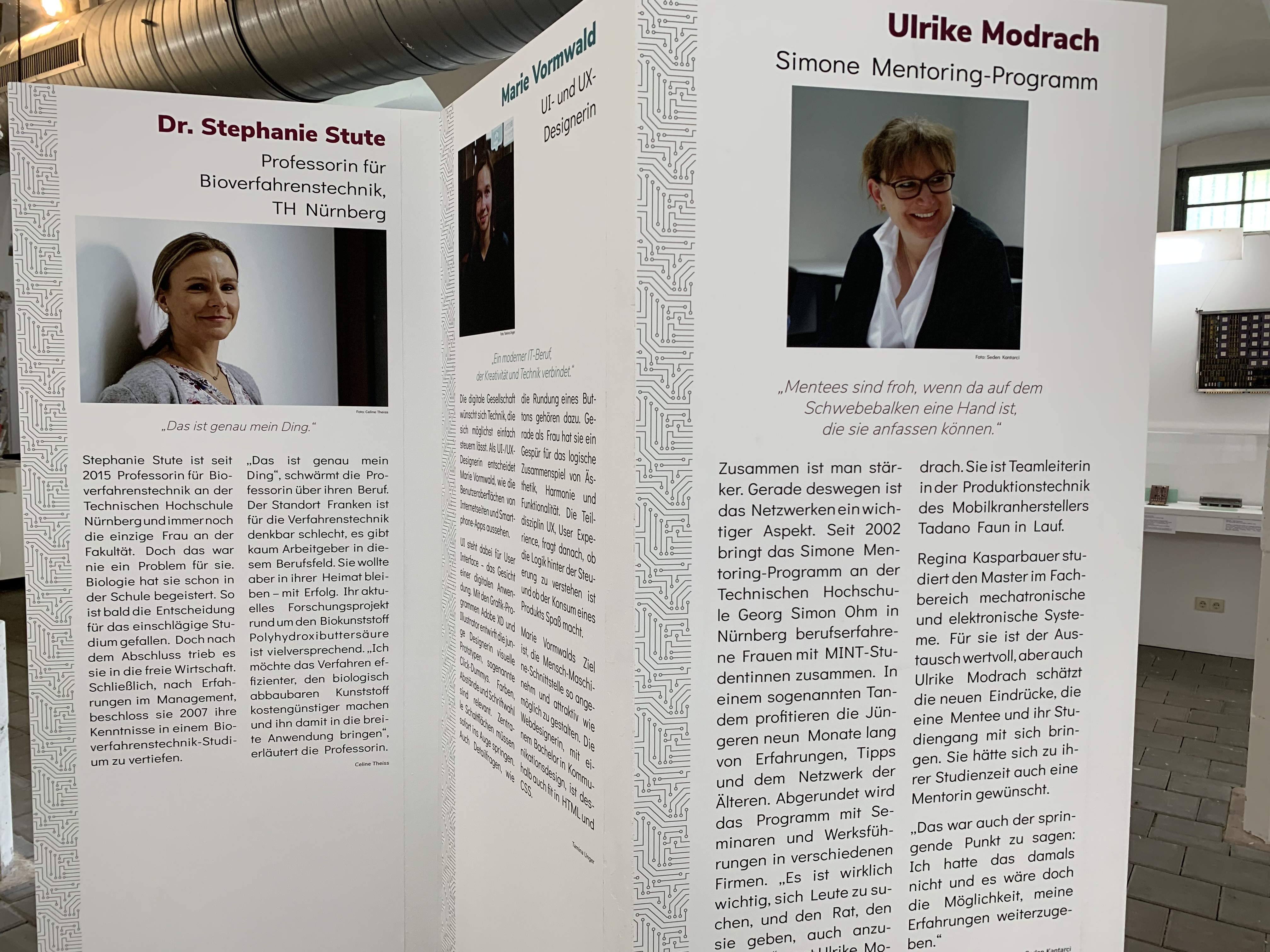Einen großen Teil der Ausstellung machen die Frauenporträts aus, die die Veränderung von Frauenbildern in technischen Berufen und in der Forschung verdeutlichen und verschiedene Generationen zeigen. Unter der Leitung von Prof. Dr. Beatrice Dernbach vom Studiengang Technikjournalismus / Technik-PR haben die Studierenden einige der Frauen porträtiert. „Die Studierenden haben verschiedene Interviews mit vielen interessanten Frauen geführt und waren dafür auch in Industrie- oder Handwerksbetrieben. Dabei haben sie mit viel Engagement die beruflichen Laufbahnen und die damit verbundenen Herausforderungen und Motivationen der Frauen herausgearbeitet“, sagt Prof. Dr. Beatrice Dernbach. Eine der Porträtierten ist dabei selbst aus der TH Nürnberg: Prof. Dr.-Ing. Stephanie Stute, die bislang noch einzige Frau an der Fakultät Verfahrenstechnik. Auch Ulrike Modrach, Teamleiterin in der Produktionstechnik des Mobilkranherstellers Tadano Faun in Lauf, wird porträtiert. Sie ist eine der Mentorinnen im Technik-Mentoring-Programm „simone“ der TH Nürnberg, das Studentinnen und erfahrende Ingenieurinnen oder Informatikerinnen für einen Erfahrungsaustausch zusammenführt. An der