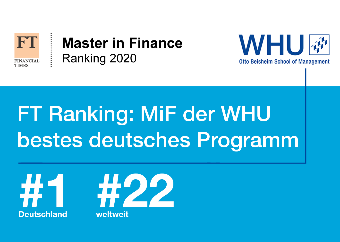 Das FT Masters in Finance Ranking 2020 bewertete insgesamt 55 MiF-Programme weltweit. Gerankt wurden neben den Aspekten Internationalität, Gehalt und Karriereservice auch Kriterien wie Karrierefortschritt und Diversität. Zusätzlich zu der Befragung von Absolventen und Absolventinnen fließen in die Bewertung auch Angaben der Hochschulen ein. Gemeinsam mit dem FT MiF-Ranking ist die WHU in allen Degree-Programmen die Nr. 1 in Deutschland.