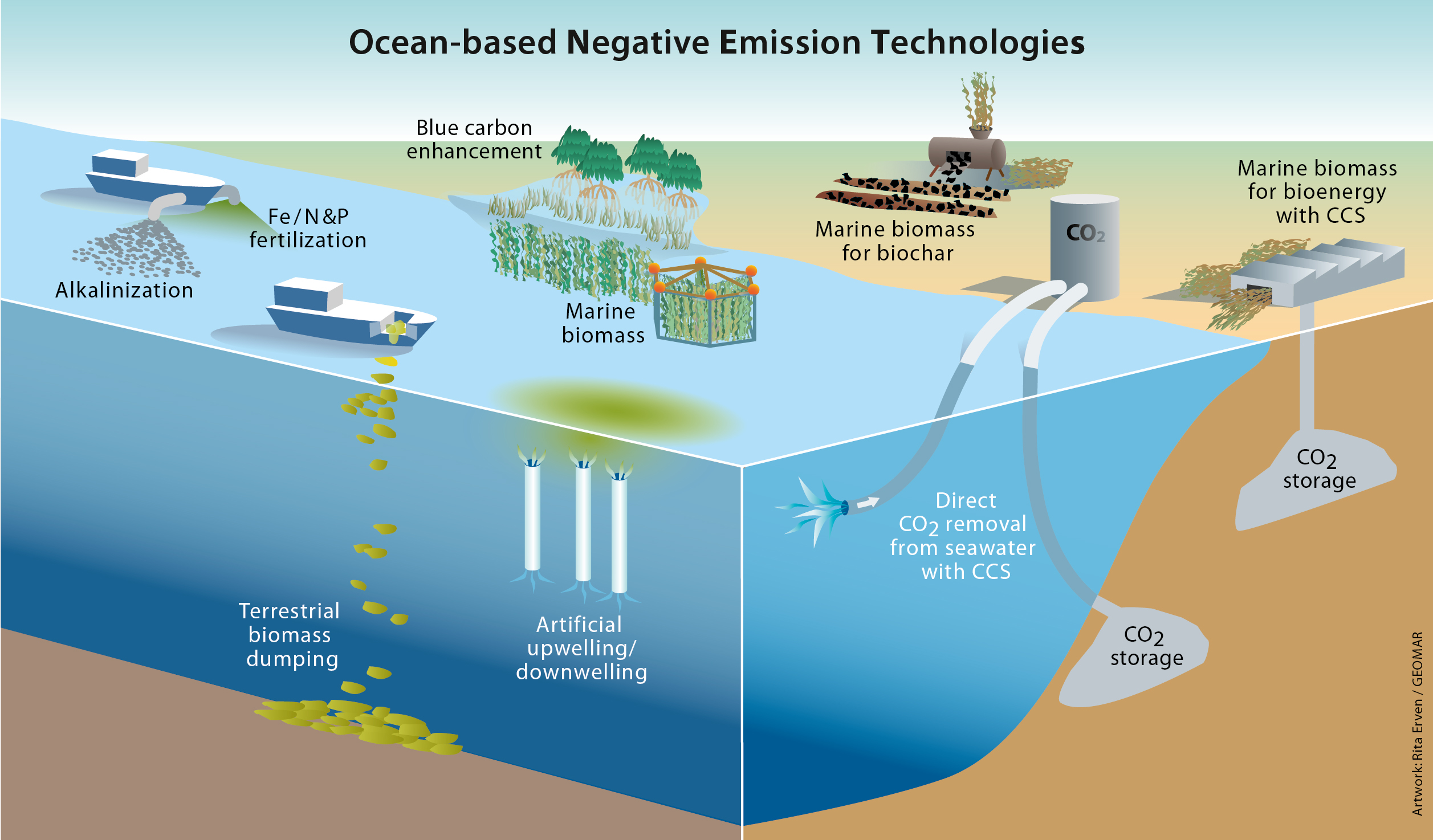 Solche Technologien mit negativen Emissionen (NETs) werden bereits seit mehreren Jahren auf Potenziale, Risiken und Nebenwirkungen hin untersucht. „Bisher lag der Schwerpunkt jedoch meist auf landgestützten Methoden“, sagt Dr. Keller, „das Wissen über ozeanbasierte NETs ist nach wie vor begrenzt, obwohl der Ozean schon wegen seiner Oberfläche und seines Volumens eine viel höhere Kapazität zur Kohlenstoffaufnahme und -speicherung besitzt.“