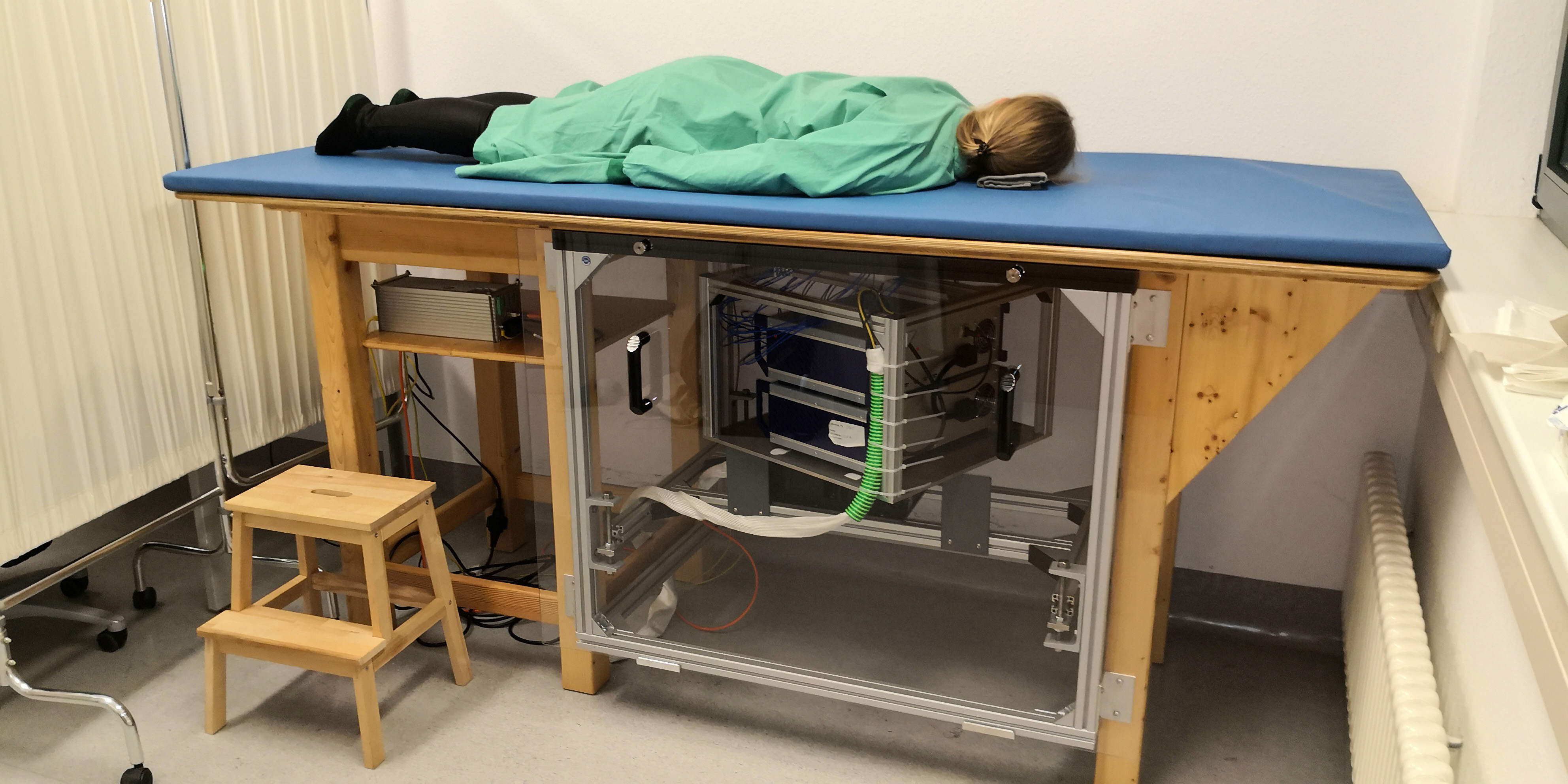Das Messkonzept der Mikrowellen-Sensorik ist technisch ausgereift – die Tücke liegt in der Anpassung an die klinische Anwendung. Dafür arbeiten die Jenaer Wissenschaftler mit Ingenieuren des Instituts für Biomedizinische Technik und Informatik der TU Ilmenau zusammen, die Kooperation wird von der Deutschen Forschungsgemeinschaft gefördert. Den Partnern ist es gelungen, die technologischen und ethisch-rechtlichen Grundlagen für klinische Messungen zur Mikrowellen-Bildgebung der Brust zu schaffen. Sie konstruierten einen Messaufbau mit Sende- und Empfangsantennen, wobei die Brust, bequem in einer Mulde liegend, untersucht wird. Im Gegensatz zur Röntgenmammographie ist keine Fixierung durch Druck notwendig, die manchmal als schmerzhaft empfunden wird. Für den Machbarkeitsnachweis entwickelten die Wissenschaftler ein Modell, das die Anatomie und die Gewebestruktur der weiblichen Brust nachbildet.
