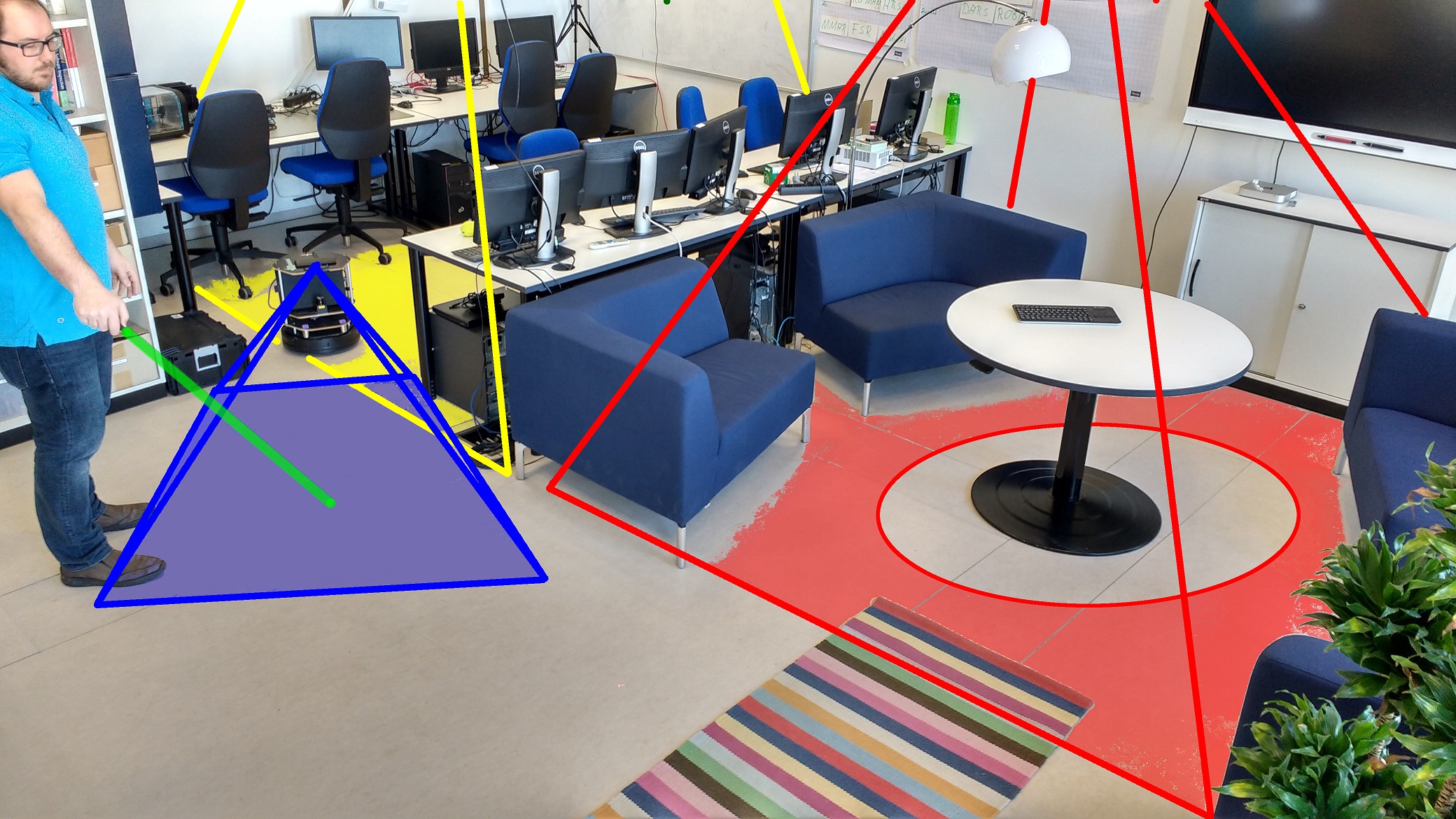 Der Nutzen: Beispielsweise können sensible Bereiche wie Bade- oder Schlafzimmer, oder Stellen, die zu Navigationsfehlern führen können, wie zum Beispiel Teppiche, vom Arbeitsbereich ausgeschlossen werden. Bei dieser neu entwickelten Methode wird die Umgebung durch ein Netzwerk verteilter Kamerasensoren überwacht. Die Grenzen des Arbeitsbereichs können vom Benutzer einfach per Laserpointer auf dem Boden aufgezeigt werden. Kennzeichnend ist hierbei die Verwendung einer mobilen Kamera auf dem Roboter, mehrerer ortsfester Kameras in der Umgebung und die Bildung eines Netzwerks aus allen Komponenten, um die aufgezeigten Grenzen des Nutzers wahrzunehmen. Mittels einer entsprechenden Steuersoftware werden diese Linien anschließend vom Roboter als virtuelle Grenzen respektiert, sodass der Roboter sein Navigationsverhalten entsprechend anpasst.
