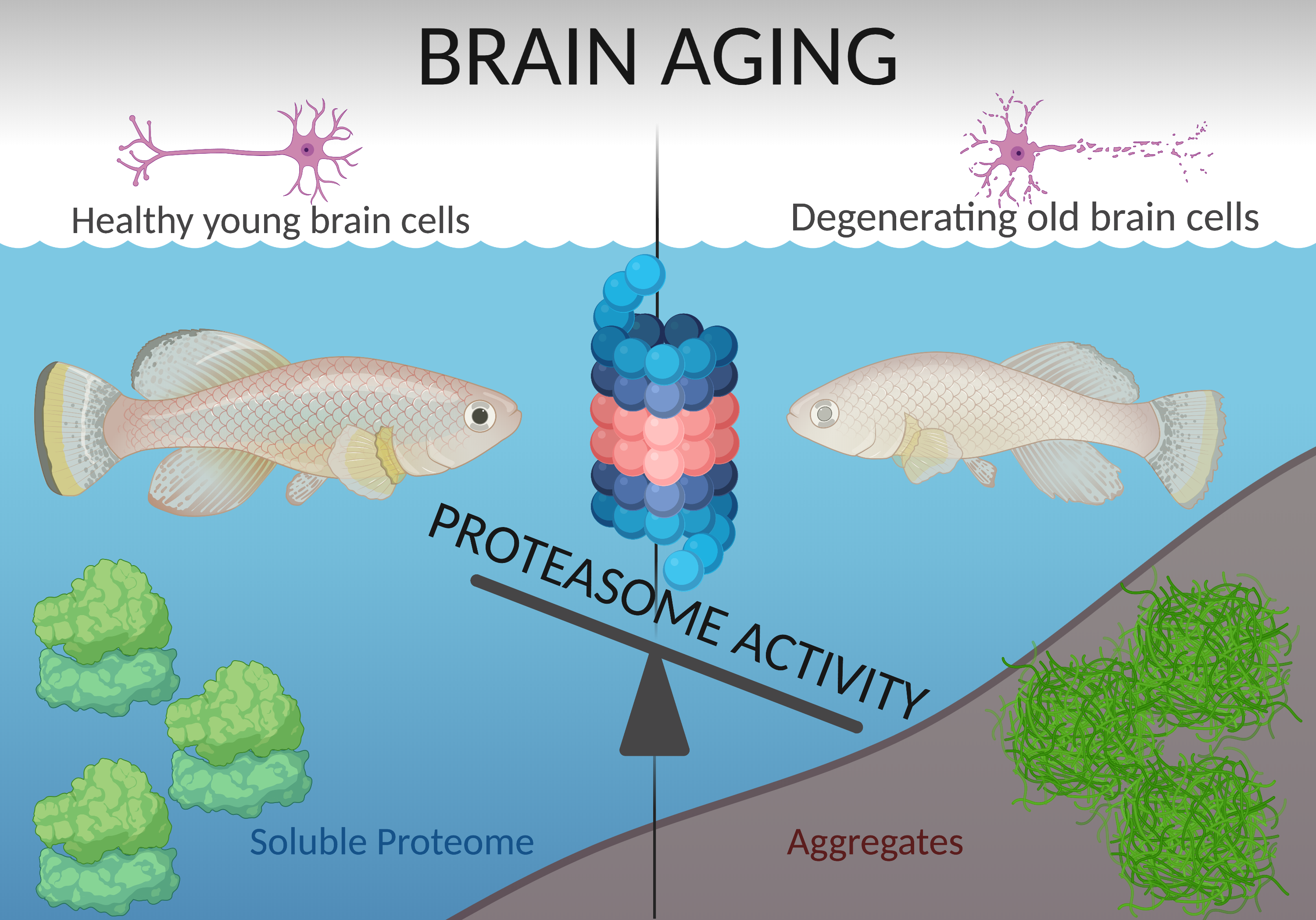 Aging is the main risk factor for dementia and Parkinson’s disease. As age progresses, toxic protein aggregates pile up in the brain and impair neuronal function. But why does that happen? An international team of scientists coordinated by the Leibniz Institute on Aging - Fritz Lipmann Institute (FLI) (Jena, Germany) and the Scuola Normale Superiore (Pisa, Italy) found answers by studying the brain of the turquoise killifish (Nothobranchius furzeri) brains. They delineate a timeline of molecular events during aging that is triggered by the early reduction of proteasome activity and culminates in aggregates formation. Remarkably, fish that preserve proteasome levels during aging live longer.